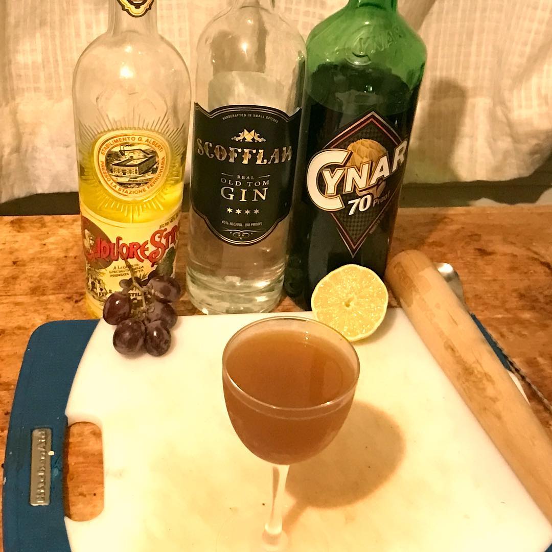 The muddled Concord grapes add a bit of fruit-forward sweetness that is balanced by the tart lime and bittersweet Amaro (Cynar). The Old Tom Gin adds nice botanical notes as the base spirit and works nicely with the herbal and honeyed sweetness of the Strega