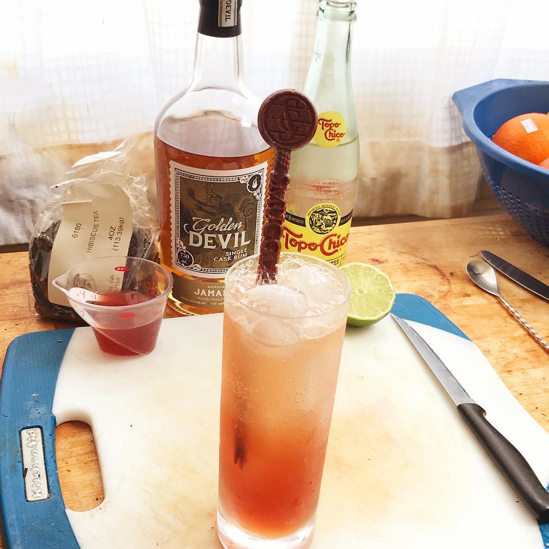 The ginger and hibiscus in the Hibiscus Cordial gives a spicy and floral sweetness that pairs well with the funky, aromatic Aged Jamaican rum with lime and seltzer added to cut sweetness and add some bubbles
