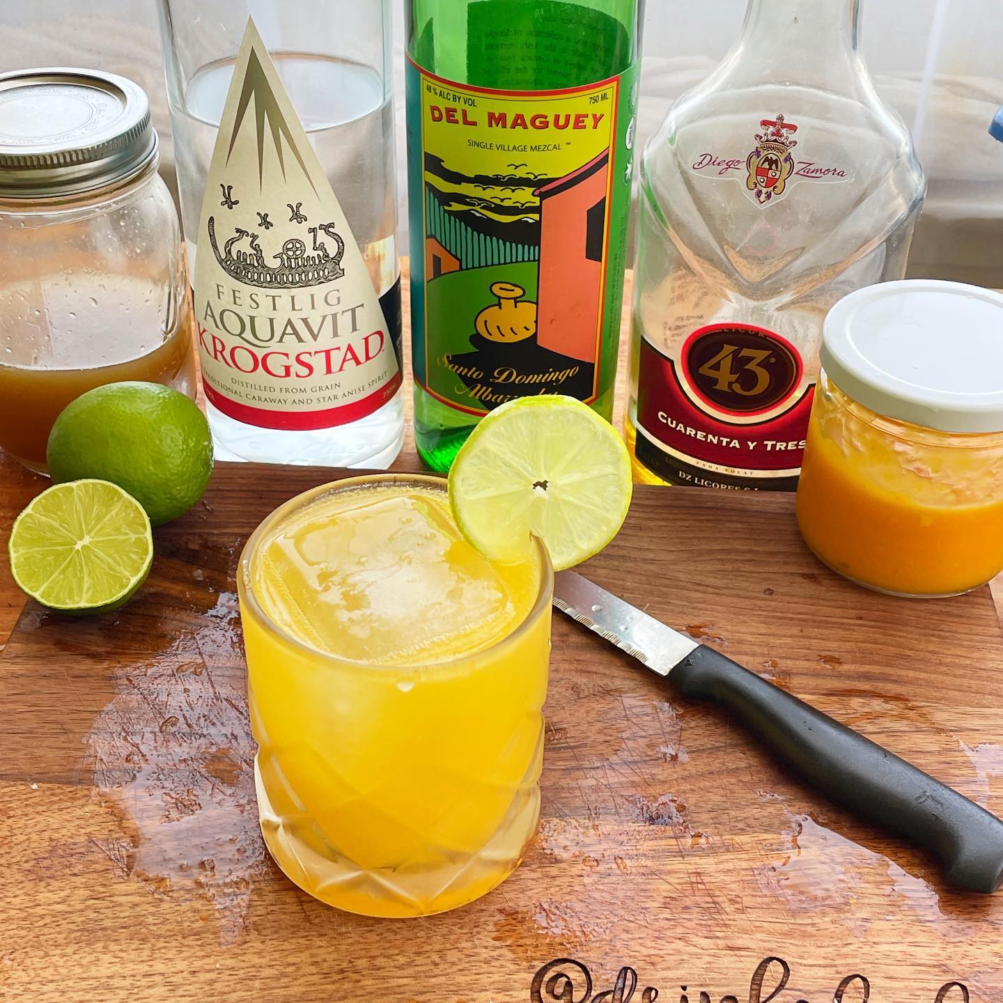 The Santo Domingo Albarradas mezcal has more floral notes (rather than more typical earthy/smoke accents) along with citrus zest that pairs well with the fennel/star anise notes in the unaged aquavit. The base spirits both complement the tropical sweet/slightly floral notes of ripe mango while fresh lime juice brings some balancing acidity. A touch of ginger syrup adds a spicy accent while the vanilla liqueur adds some complementary flavor to the mango