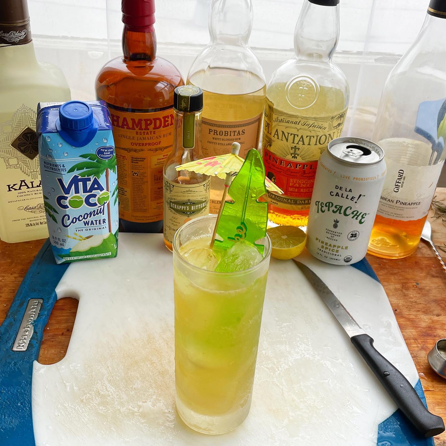 The trio of rums (blended lightly aged, Overproof Jamaican, pineapple-infused) provides a base with huge tropical aromas and caramelized sugar flavor that plays really well with the pineapple (liqueur and tepache) and coconut notes (liqueur and coconut water) while the lime adds brightness and the tepache helps add zip and effervescence