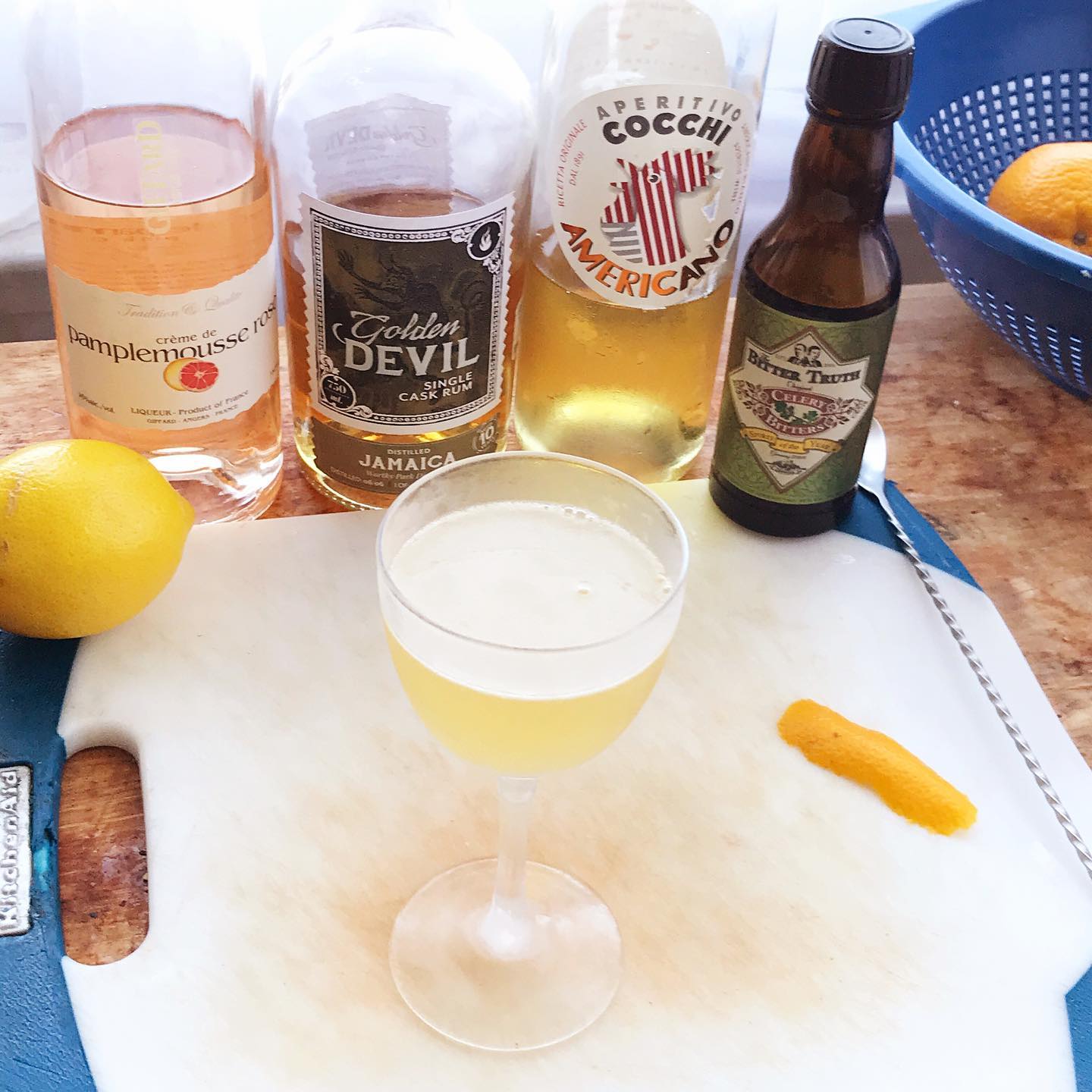 The pot still Jamaican rum provides notes of tropical fruit and funk which stands up to the bittersweet notes from the grapefruit liqueur and quinine-fortified white wine aperitivo. The citrus notes in the lemon juice act with the aperitivo to lighten the drink while the celery butters provide some herbal/citrus notes that tie everything together .75 oz Pot-Still Jamaican Rum (Hampden Estate, Worthy Park 10, Smith & Cross, etc)