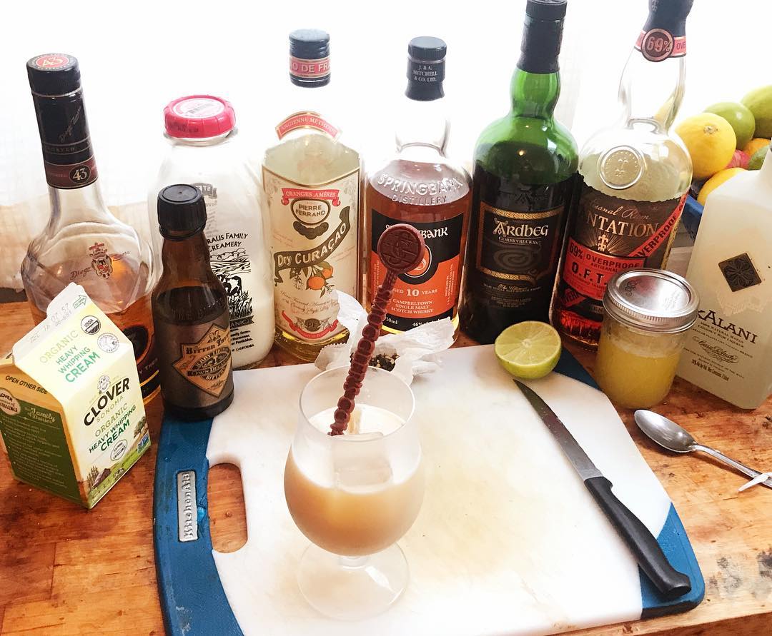 A delicious Tiki drink from Jillian Vose of NYC’s Dead Rabbit (slightly reformulated to work with my pantry) that takes advantage of the affinity of smoky scotch for tropical flavors 🍍🥥💨 The base Scotch has notes of pears, honey, and dried fruit that is enhanced by the smoke from the Islam scotch and the dried fruit/molasses/coffee notes of the Overproof Rum. The coconut liqueur, genmaicha tea syrup, pineapple/lime combo, vanilla Liqueur, and orange curaçao give a nuanced sweetness with orange, tropical fruit and grassy/puffed rice. The cream smoothes out the drink and the clove-forward bitters and curry leaf lend a bit of spice. Creamy, tropical, smoky, delicious!