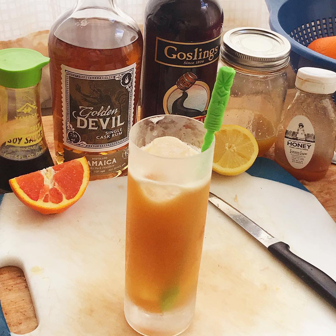 The molasses and vanilla notes in the rum are complemented by the honey and offset by the bright fresh citrus and ginger spice while the touch of salt from the soy makes all of other flavors pop