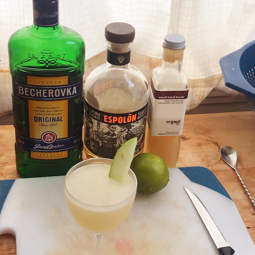 The barrel spice in the reposado tequila, cinnamon notes in the Becherovka, nutty/malty notes from the orgeat all combine with just a bit of lime juice to give the impression that the drink tastes of green apples (and cinnamon and tequila)