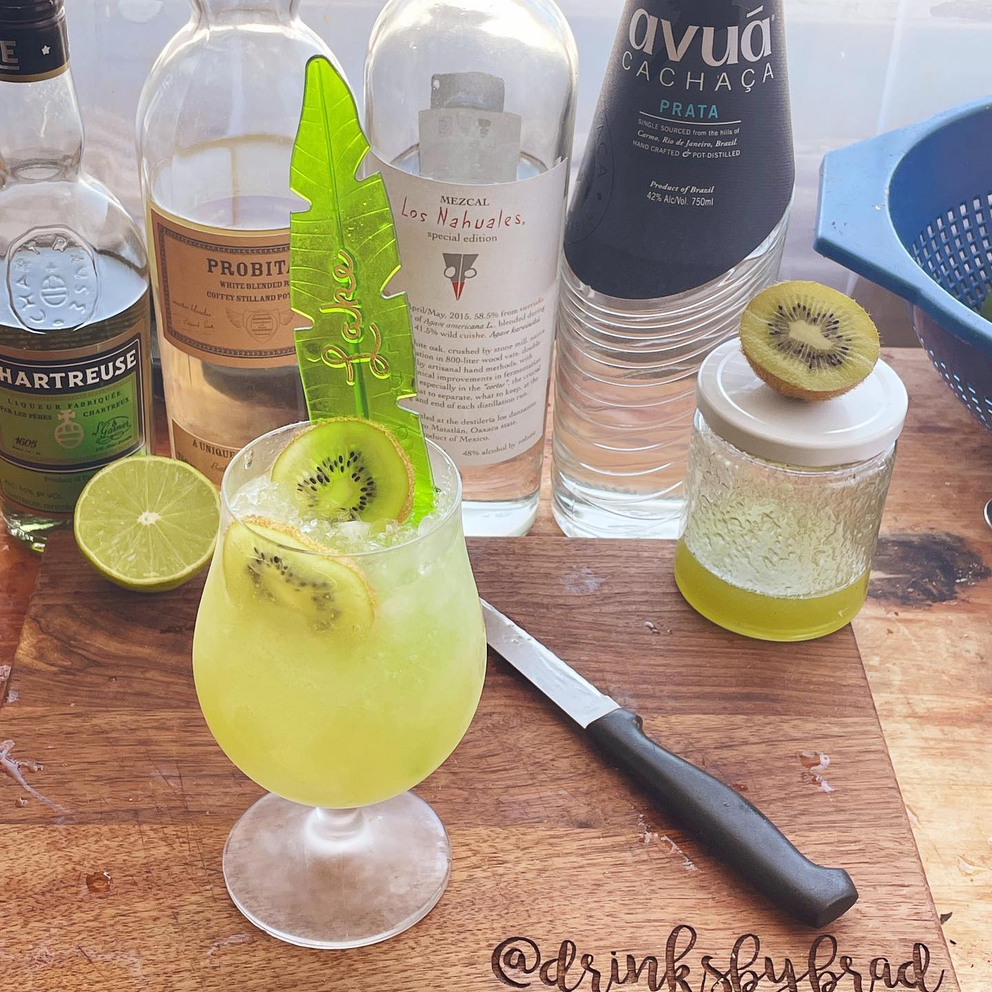 The mezcal contributes notes of tropical fruit, citrus zest, and smoke that combine with the funky blended rum and grassy funk of the unaged cachaca to form a base that accentuates the flavors of the ripe kiwi and the herbaceous notes of the Chartreuse. Fresh lime juice brings balancing acidity and helps tie all of the flavors together