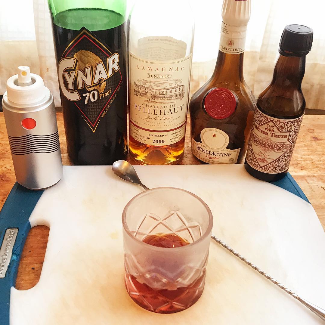 The dark and bittersweet amaro Cynar is balanced by the saffron and honey sweetness of the Benedictine liqueur which both work well with the fruit and toffee notes in the aged armagnac. The spritz of Islay scotch adds a nice smoky aroma that makes the drink an excellent choice as the weather cools during Fall .5 oz Armagnac (feel free to choose your favorite, I enjoy Chateau de Pellehaut, but many other good bottles imported by Charles Neal and others)