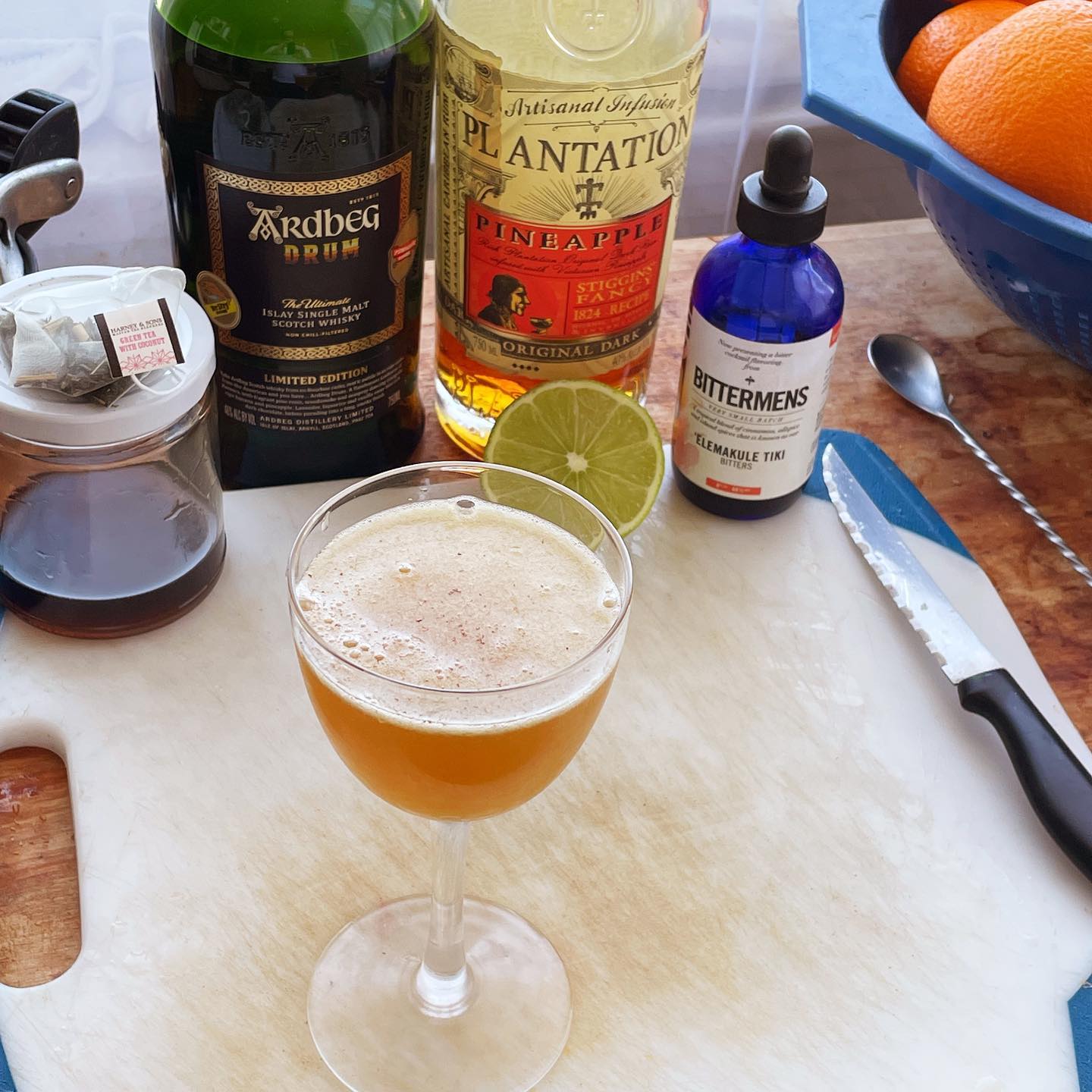 The blend of peat/smoke and sherry age flavors in the Islay scotch work in great harmony with the roasted pineapple notes in the infused rum while the coconut green tea syrup helps bridge the flavors of the spirits with the bright, tart lime juice and the Tiki bitters add a hint of ginger and baking spice