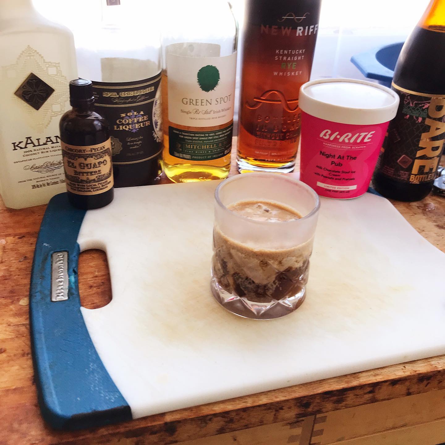 A boozy Affogato built around some delicious local ice cream and pastry stout 🥃🍫☕️🥥🥜 The chocolate and peanut notes in the ice cream pair wonderfully with the coffee, coffee, and coconut notes in the barrel aged stout. The Irish Whiskey and bonded rye bring additional complementary notes of honey, cereal grain, caramel, and a touch of cinnamon while the coffee and coconut liqueurs and chicory coffee/pecan bitters boost the flavors in the drink. Decadent and delicious!