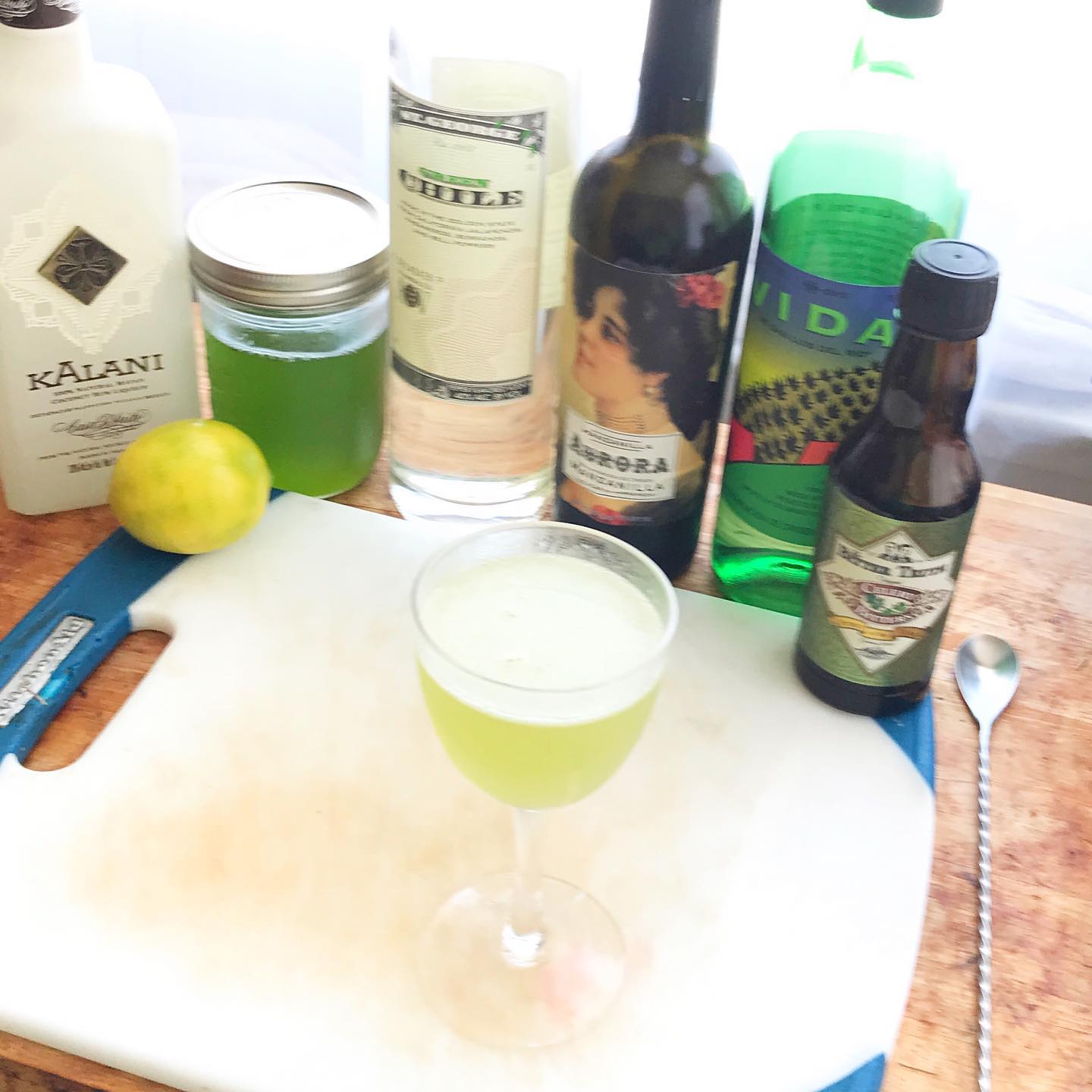 A savory, intriguing low-ABV Daiquiri riff with hints of smoke, spice, and coconut 🐸🥒🌶🥥 The dry, white wine-like Manzanilla sherry brings notes of green apple and saline that complement the green chile and smoke notes from the Green Chile vodka and mezcal. The salted cucumber cordial and lime lend notes of the cooling Limon Pepino you can find at certain Mexican/Central American markets. The bitters tie together the flavors and the splash of coconut liqueur adds an important touch of nuanced, tropical sweetness that rounds out the otherwise savory, vegetal notes in the drink. An excellent, refreshing drink for a hot summer evening!