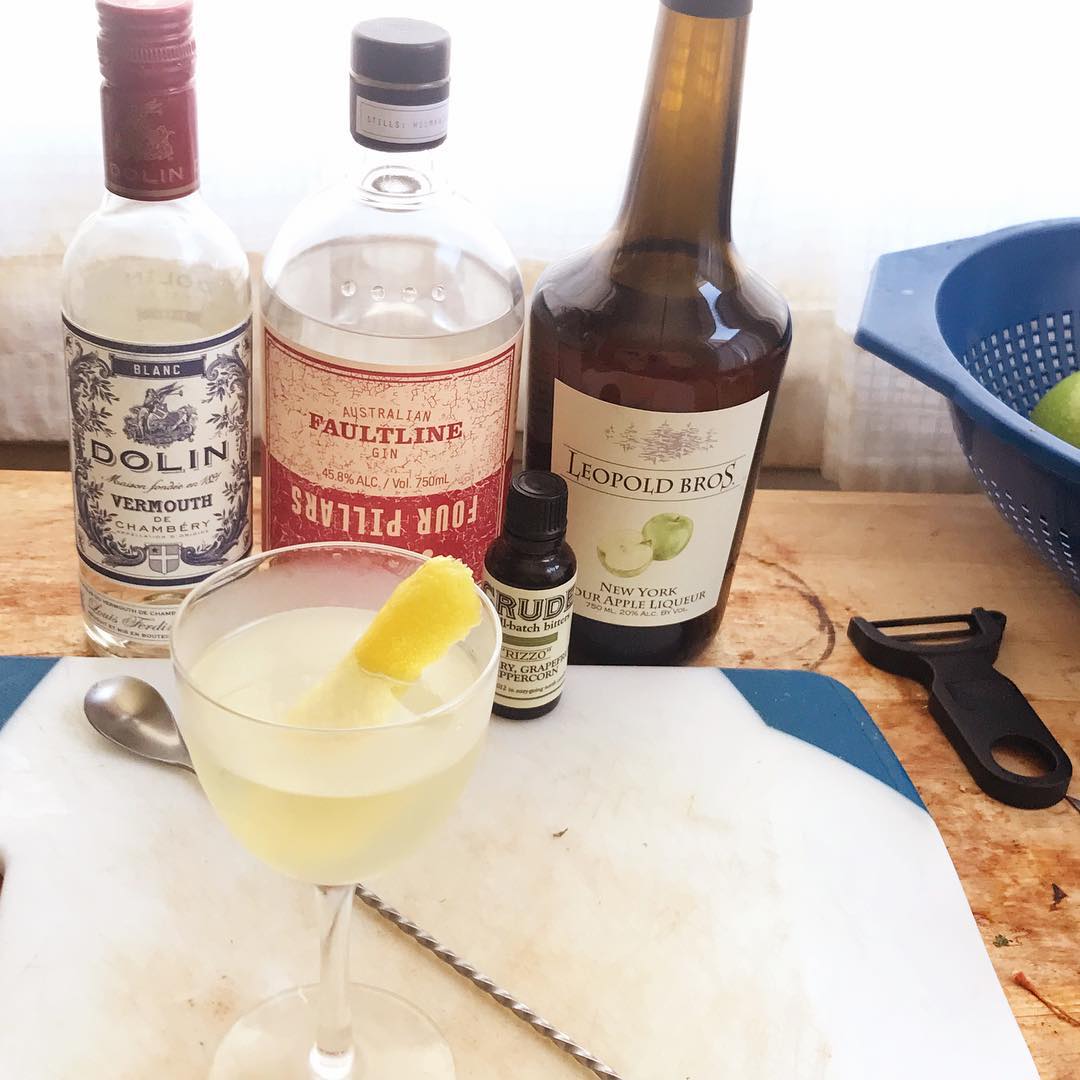 The swap of Blanc/Bianco vermouth for the more traditional dry gives sweetness and softer botanical notes while the Leopold Sour Apple gives a hint of tartness without adding citrus