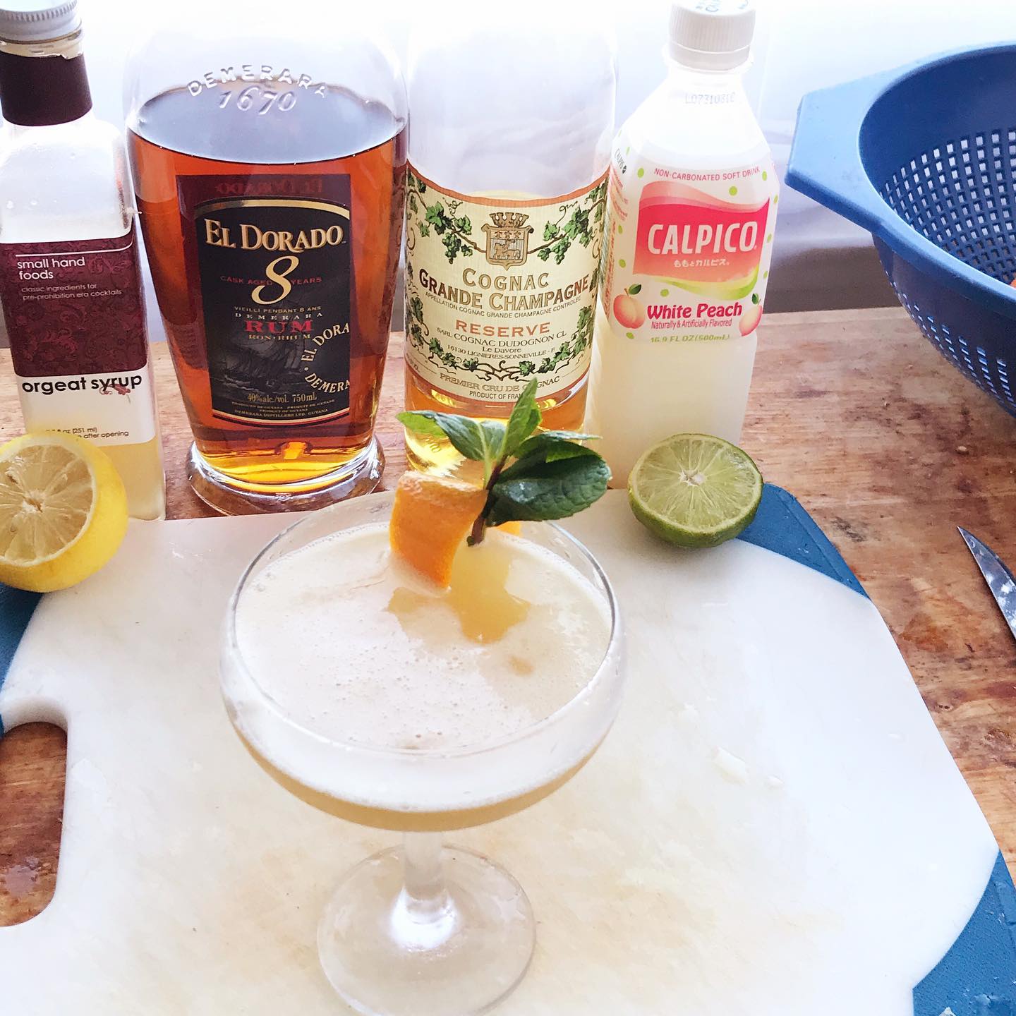 .5 oz Calpico (plain works, but I also like the subtle fruit notes of the White Peach option with the orgeat and Cognac)