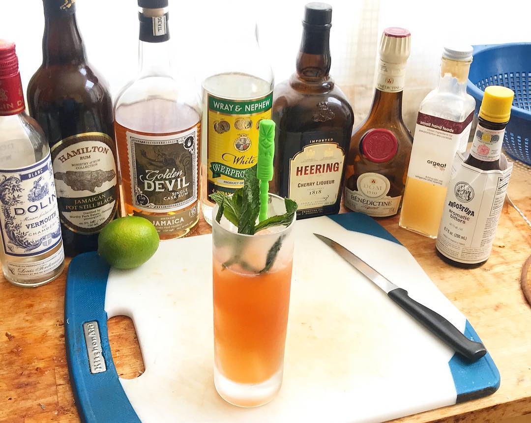 The Jamaican rums bring tropical aromas and molasses notes that are complemented by the nuanced sweetness from the Cherry Heering/almond syrup(Orgeat)/Benedictine/Blanc vermouth and spice notes in the Angostura while the lime brightens the drink .75 oz Unaged Jamaican Overproof Rum (Wray & Nephew or Rum Fire)
