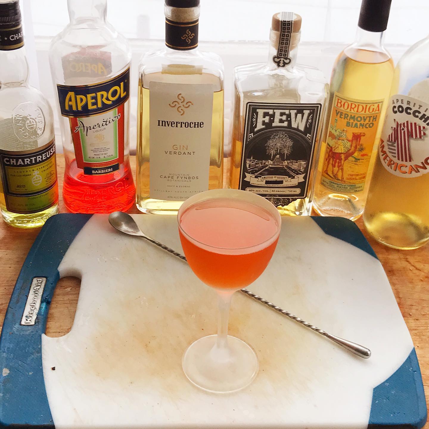 The soft, floral notes in the South African gin (especially Chamomile) are boosted by both the Malort and the Blanc vermouth/White wine-based aperitif while the Aperol works with the Malort to provide a bittersweet counterpoint that works really well. The Yellow Chartreuse adds complementary herbal notes while also adding a bit of needed sweetness