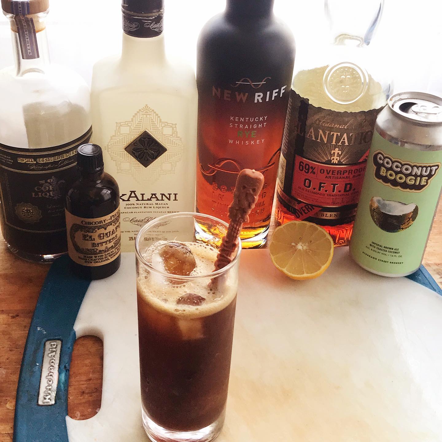 A tropical beer cocktail that drinks light despite the deep, roasted flavors 🥥☕️ The toasted coconut notes in the porter work nicely with the barrel spice of the rye and the coffee and molasses notes in the overproof rum. The coffee and coconut liqueurs and chicory/pecan bitters complement these flavors while the lemon juice balances and lightens the drink