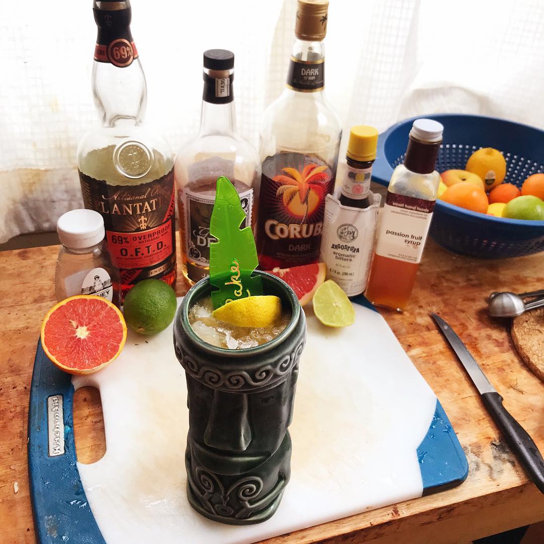 The tropical blend of citrus fruit (Cara Cara orange, grapefruit, lime, passionfruit, calamansi) provides a great foil to the bold molasses/dark fruit/tropical fruit/coffee notes from the trio of rums while the honey and Angostura spices tie everything together into a delicious blender drink
