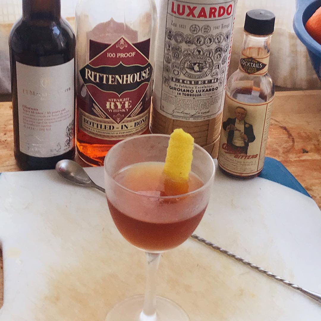 The raisin and toffee notes from the sherry pairs really well with the spiciness of the Rye and bitters while the Maraschino liqueur brings an enjoyable (and complementary) fruit note