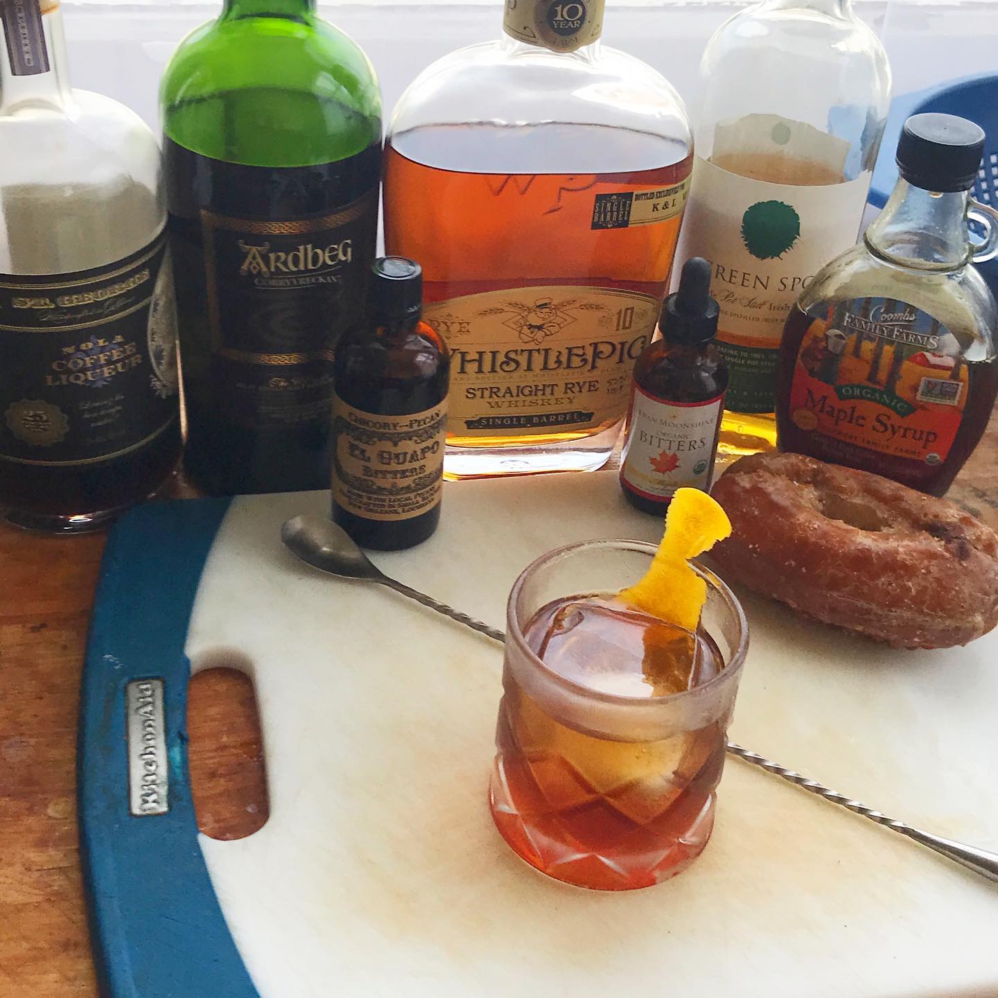 A comforting breakfast-inspired Old Fashioned that was designed to pair well with a donut 🍩🥃 The caramel and spice notes in the Rye whiskey work together with the cereal grain notes in the Irish whiskey to create a flavorful base that works nicely with the maple syrup and coffee liqueur. The splash of Islay scotch adds touches of smoke, toffee, and a whisper of salt, the bitters boost the maple and coffee flavors (and add a note of pecan) and the essential oils from a grapefruit twist adds a bright, citrusy aroma