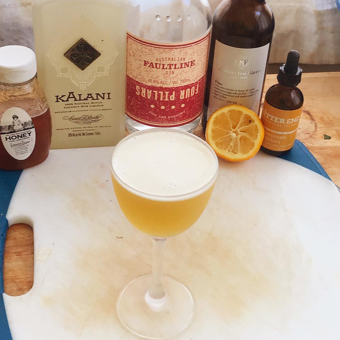 The delightful honey/coconut flavor combination is present again and is offset by the softer, Bergamot and spice accented Meyer lemon. The dry, slightly nutty sherry works well with the botanical and sandalwood notes in the gin and the bitters add a touch of sumac and spice
