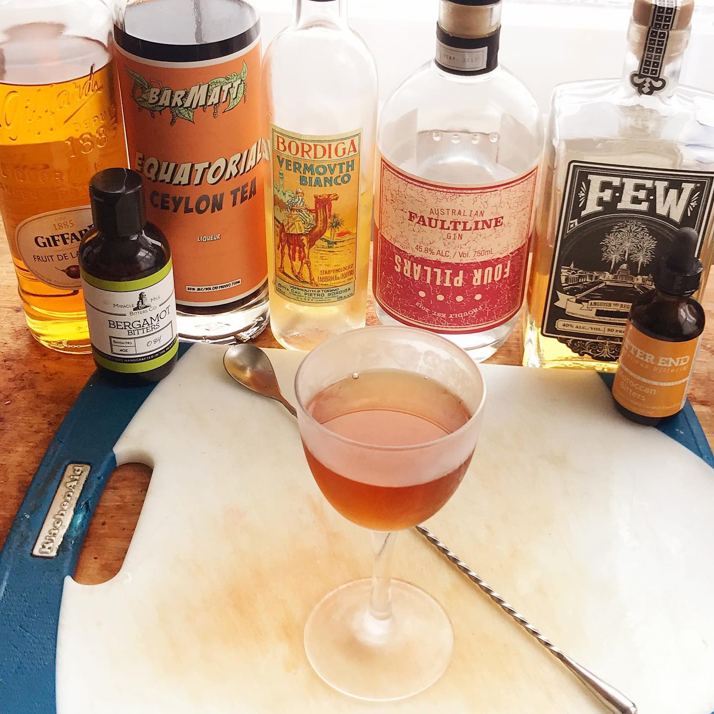 A refreshing Martini riff inspired by flavors I’d like in a cup of breakfast tea ☕️ The botanical notes in the gin work nicely with both the bergamot/tannic notes in the black tea liqueur while the Malort and Blanc vermouth contribute bittersweet notes (and a bit of floral aroma in the Malort). The bit of passion fruit liqueur lends a hint of sweet/tart flavor while the bitters boost the aromas of bergamot and lemon peel