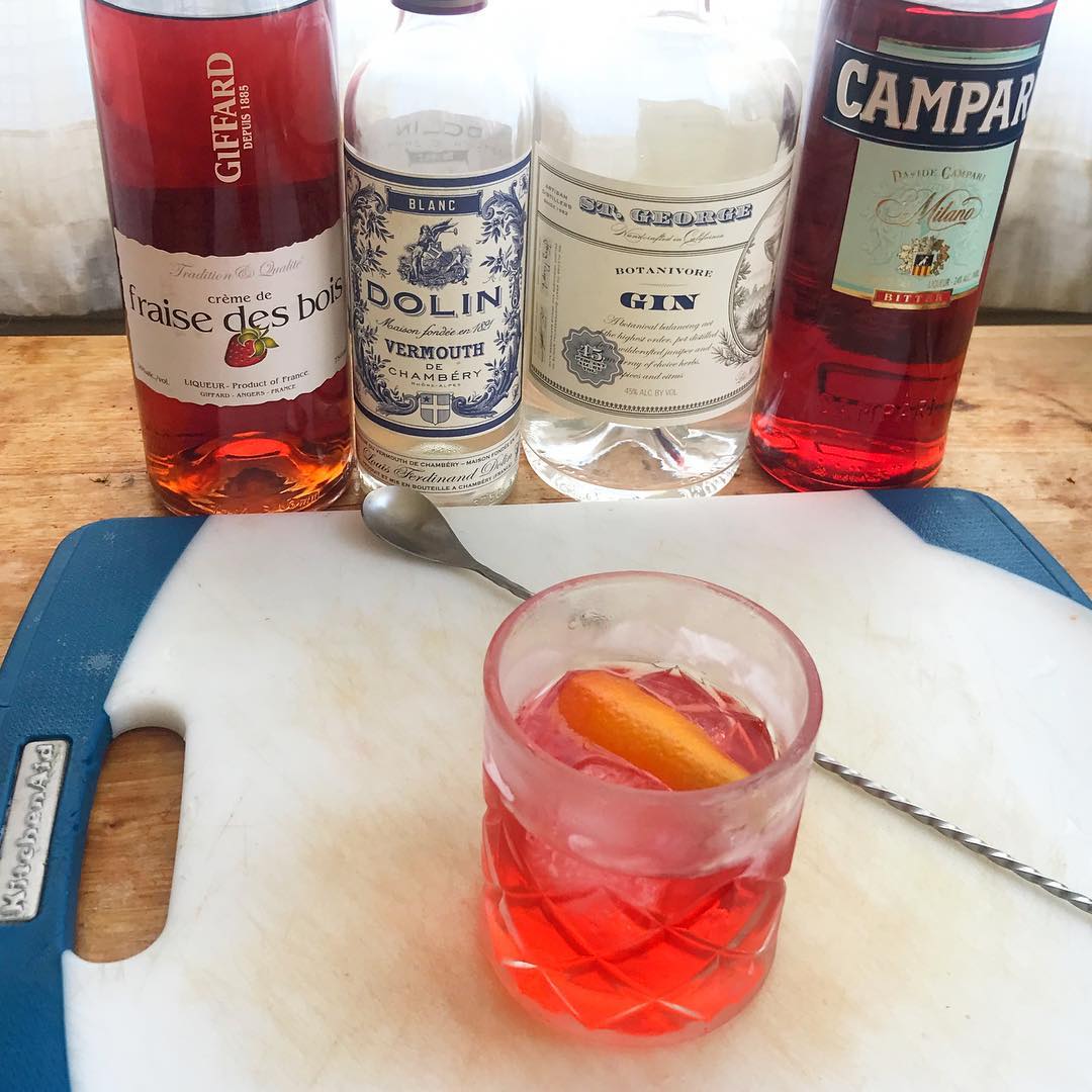 The strawberry contributes a nice berry flavor while rounding the bitterness of the Campari and the juniper of the gin a bit. The softer, botanical notes in the Blanc vermouth are a nice switch from the usual Sweet variety and the gin provides a sturdy backbone
