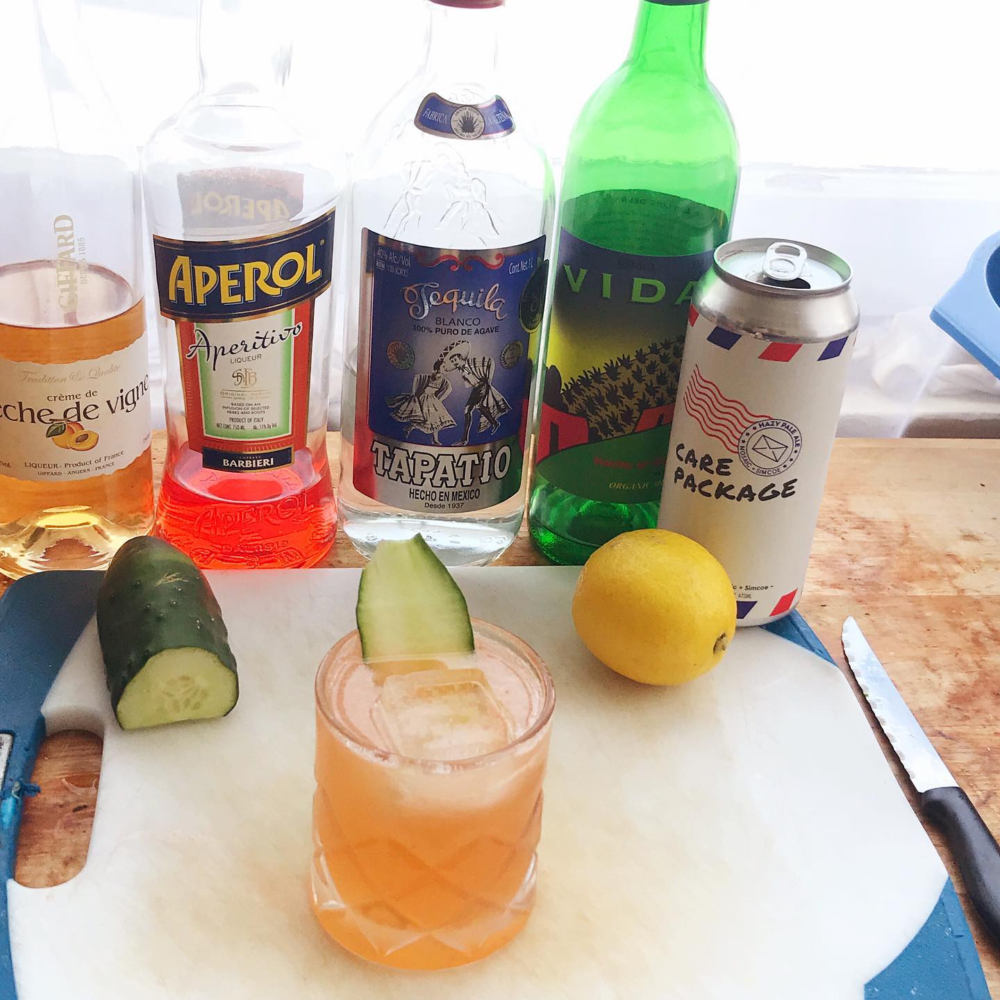 A cooling, flavorful agave-based Shandy/beer cocktail riff from Fanny Chu of NYC’s excellent Donna 🥒🍺 The agave based blanco tequila and mezcal provide a flavorful base with notes that are slightly smoky, slightly citrusy/stonefruit, and slightly vegetal. These work very well (as they do in a Gose) with the cucumber/lemon/sugar/salt in the cordial. Meanwhile the grapefruit notes in the Aperol and the stone fruit notes in the liqueur work well with the base spirits while also marrying well with the hop notes in the IPA. A very crushable drink for a warm summer day or night!