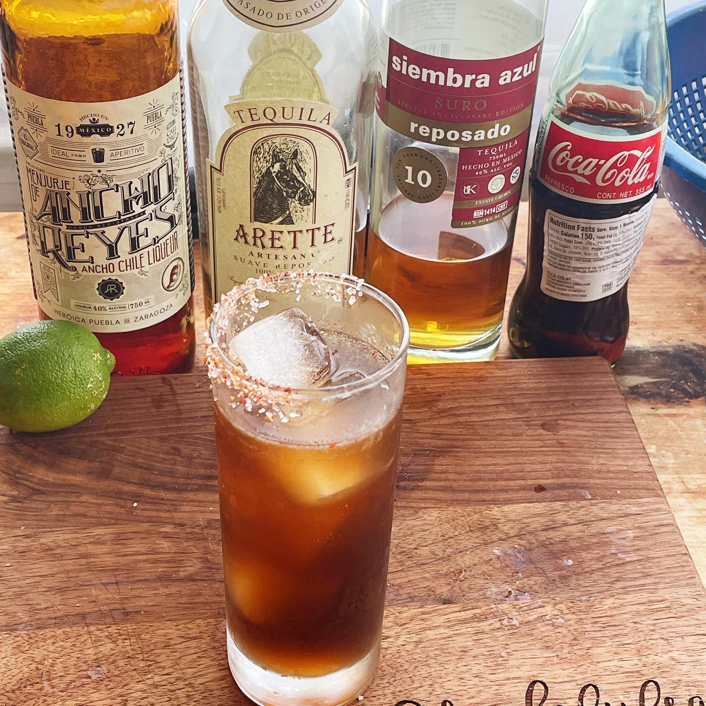 The duo of aged (reposado) tequilas have notes of citrus zest and cinnamon that complement the clove and vanilla notes in the cola. Fresh lime juice adds some zip and balancing acidity while a splash of Ancho chile liqueur adds a touch of spice while helping bridge the tequila and cola. A sea salt half rim helps the flavors pop