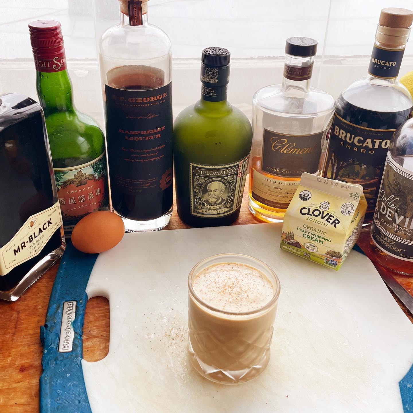 The trio of blended aged rum, aged rhum agricole, and overproof dark rum create a base with notes of caramelized sugar, vanilla, poached tropical fruit, and subtle coffee/red fruit. These flavors are boosted by additions of raspberry, chocolate, and coffee liqueurs while the whole egg and heavy cream add richness and body. A splash of an Amaro with dark chocolate/berry notes helps add a touch of bittersweet flavor while tying together the flavors. Basically a boozy raspberry chip milkshake
