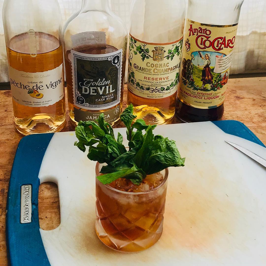 The fruit notes in the cognac and the tropical fruit esters in the pot stilled Jamaican rum create a funky, flavorful core that plays off the bright fruit notes of the peach liqueur while the bitterness in the amaro bridges the flavors and the mint bouquet gives a pleasant aroma
