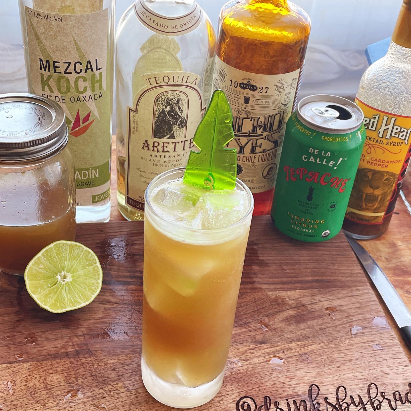The blend of lightly aged Reposado tequila and mezcal creates a base with notes of citrus zest, roasted agave, and a touch of smoke that works very well with the sweet/tart tamarind (from syrup and soda). Splashes of Ancho chile liqueur in addition to Ginger and Tamarind Ghost Pepper and Cardamom syrups add complementary hits of ginger and chili bite while also giving body to the drink while the fresh lime juice and tepache add some zippy acidity and a little effervescence