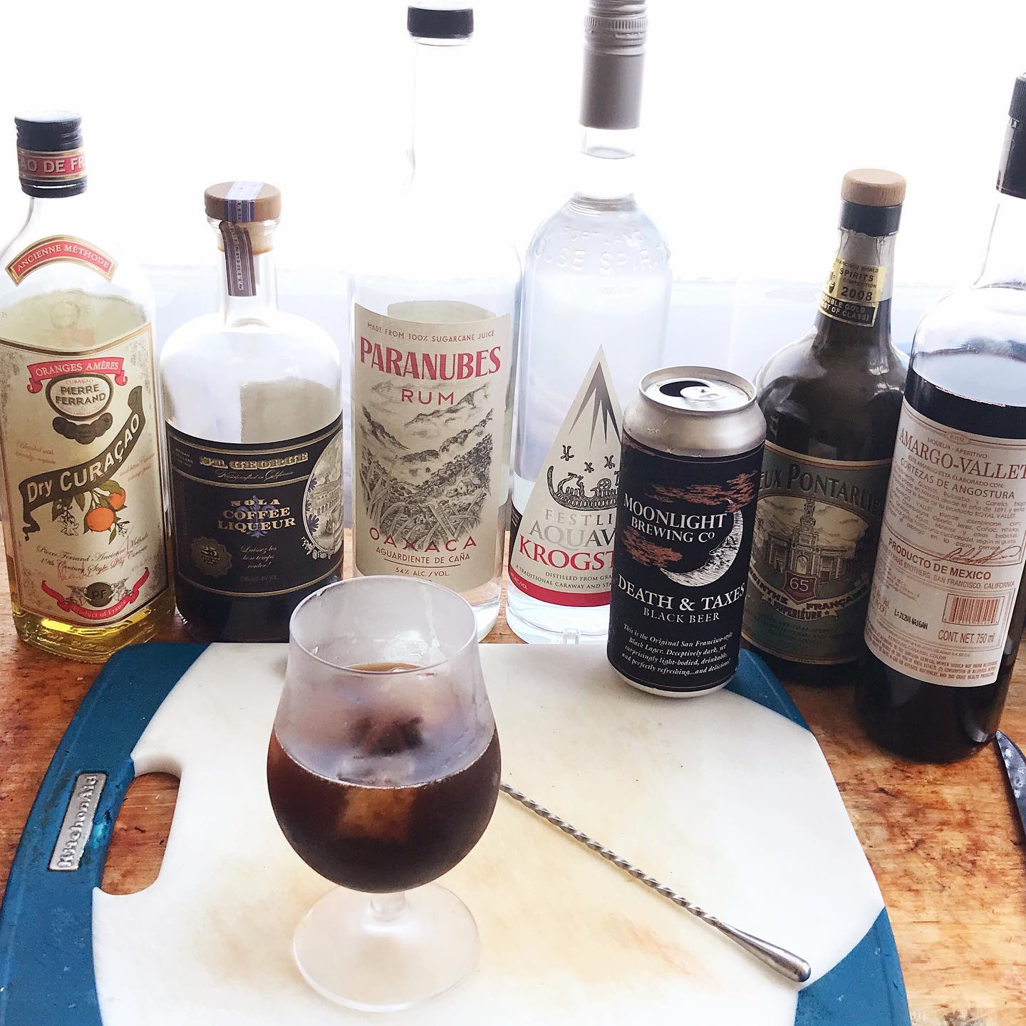 The herbal, grassy notes of the aguardiente (basically Oaxacan sugarcane rum, like Agricole rhum from the islands) work with anise notes from the unaged aquavit/absinthe and the spice/cocoa/dark fruit/bittersweet notes in the Curaçao, Mexican Angostura bark Amaro, and coffee liqueur to create a layered flavor that is completed by the roasted coffee/caramel notes and creamy mouthfeel of the beer