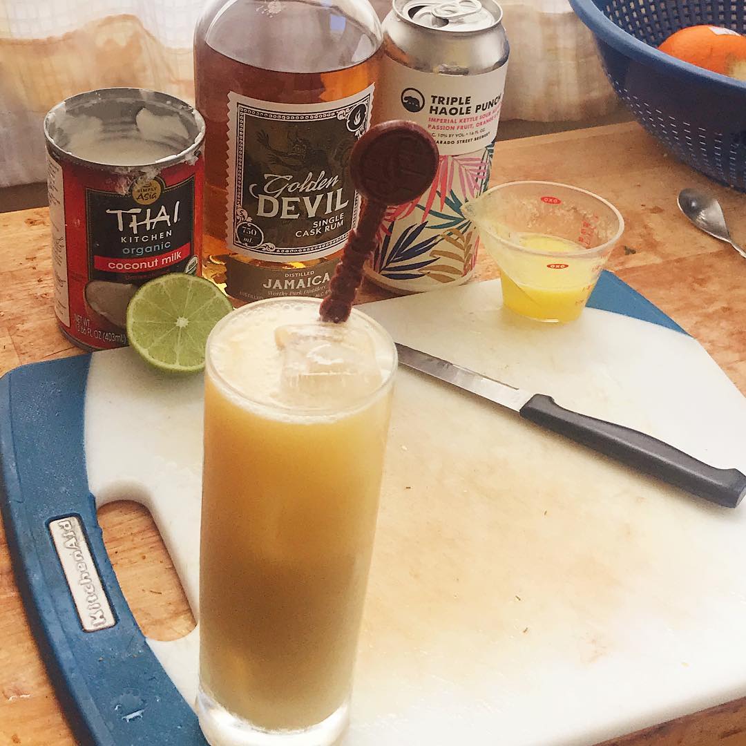 The guava and passionfruit notes from the beer mingle with the lime and pineapple juice to yield a tart, tropical fruit flavor that is complemented by the fruity aromas in the Jamaican rum. The coconut cream adds richness while enhancing the tropical notes in the drink