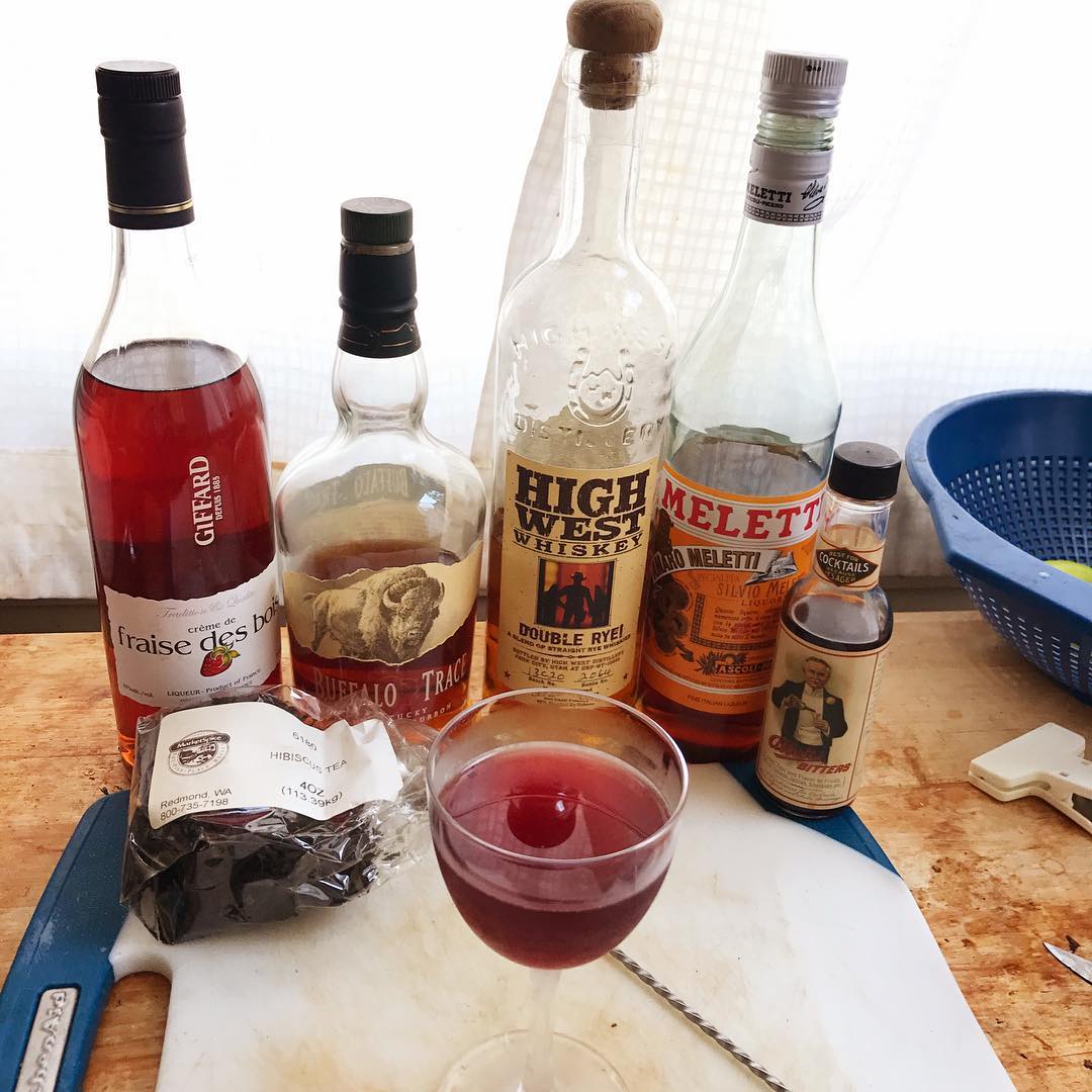Splitting the base spirit between a hibiscus tea-infused bourbon highlights the strawberry flavor without making things too sweet while the spicy Rye gives the drink needed oomph