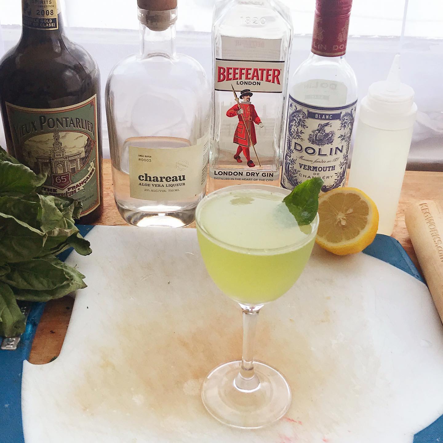 The cooling cucumber and melon notes in the aloe liqueur and the subtle botanicals and spices in the white wine-based Blanc vermouth work to soften the juniper and other botanical notes in the gin while also bridging the citrus. The muddled basil works with the cucumber and dash of absinthe to lend a green, anise note that works wonderfully with the other flavors