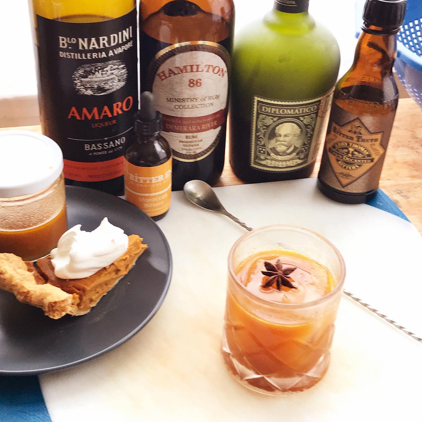 A Thanksgiving-inspired Old Fashioned that balances decadent fall flavors with a bittersweet undercurrent 🦃🍂 The blend of aged and pot still dark rums provides a flavorful base with notes of molasses and brown sugar that works very nicely with the rich pumpkin and baking spice notes in the pumpkin pie syrup while the Amaro balances the drink with some bittersweet notes. The bitters add additional clove and other complementary spice notes. Pairs excellently with a slice of pie and the amaro should help aid digestion. Happy Thanksgiving!