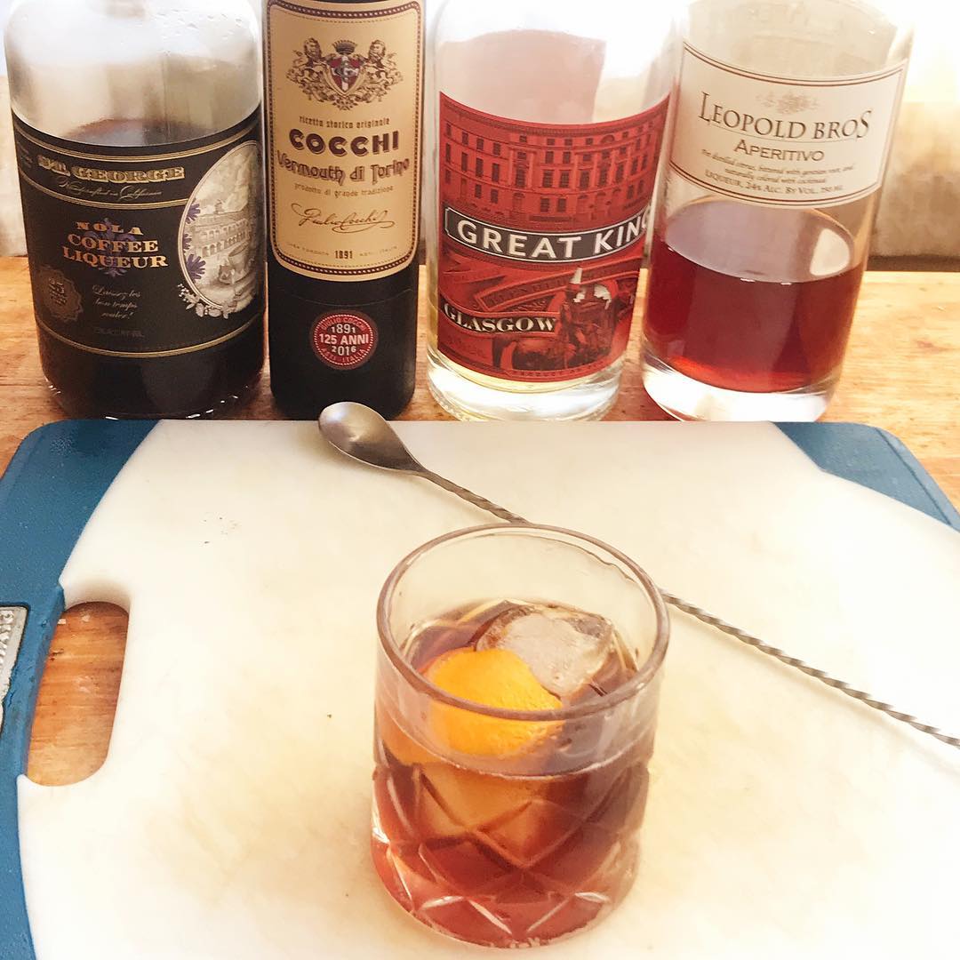 A smoky, rich Negroni variation from Wilfred’s in Edmonton, CA with Scotch and coffee