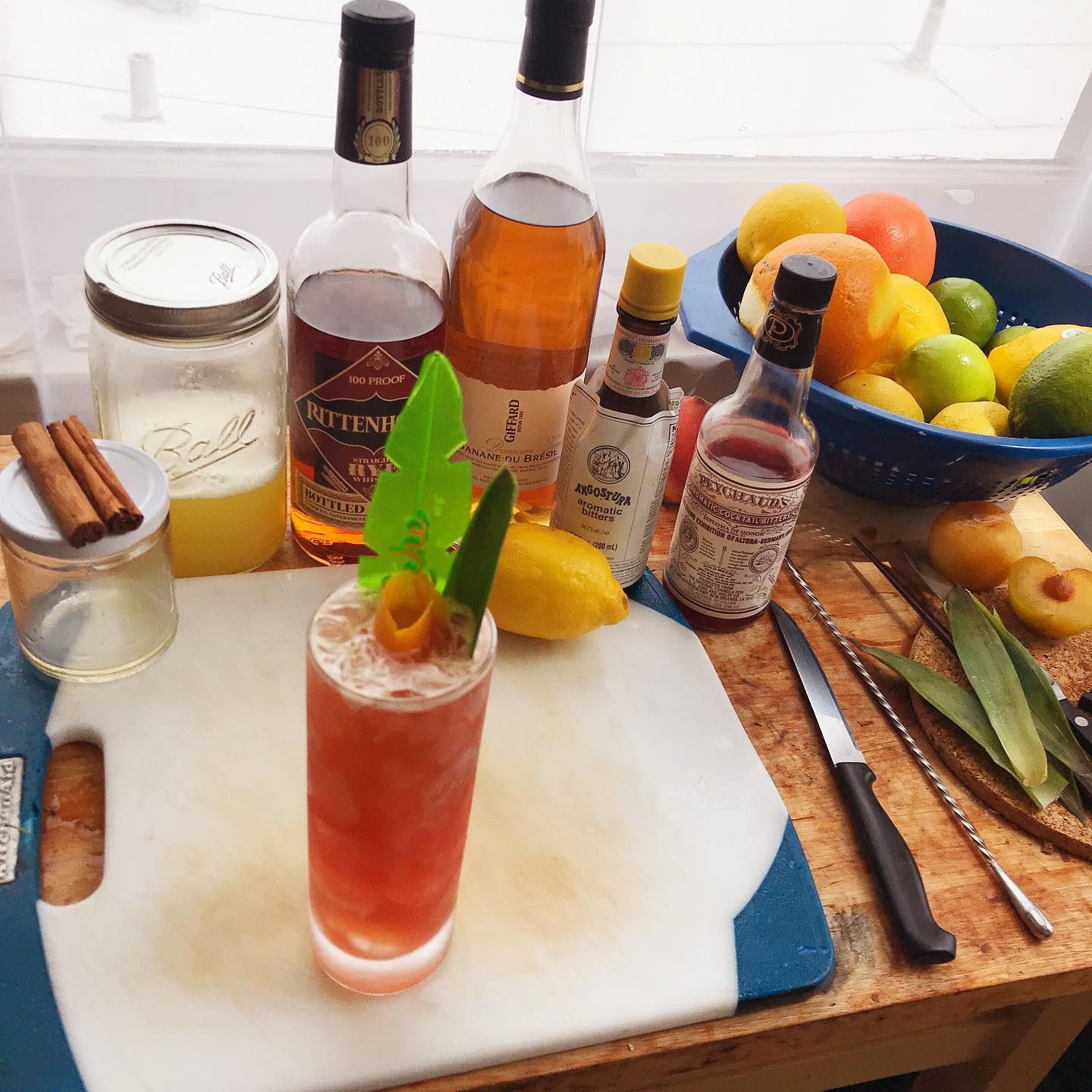 A refreshing, tropical riff on the Julep and Jungle Bird from NYC’s Shannon Mustipher that invites whiskey to the Tiki party 🦜🍍🍌🏝 The baking spice notes in the bonded rye whiskey work very nicely with the soft, rounded sweetness of the banana liqueur and also with the tropical sweet/tart notes in the pineapple and lemon juices. The cinnamon syrup and generous application of bitters boosts the baking spice/clove/allspice notes and dries out the drink a bit