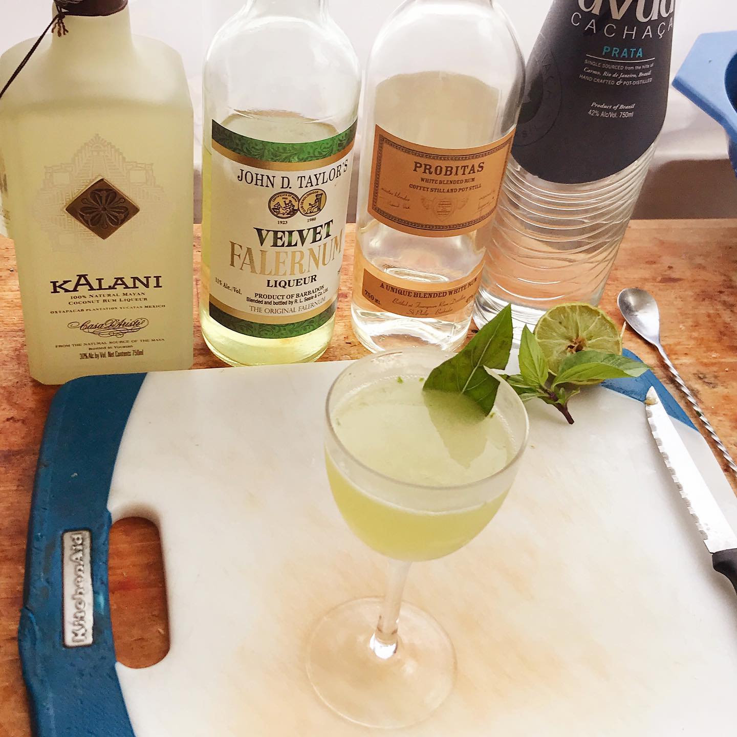The aroma of the muddled Thai basil works beautifully with the bright lime juice, the funky sugarcane notes in the rum/Cachaca blend, and the touches of coconut, clove and lime zest from the liqueurs