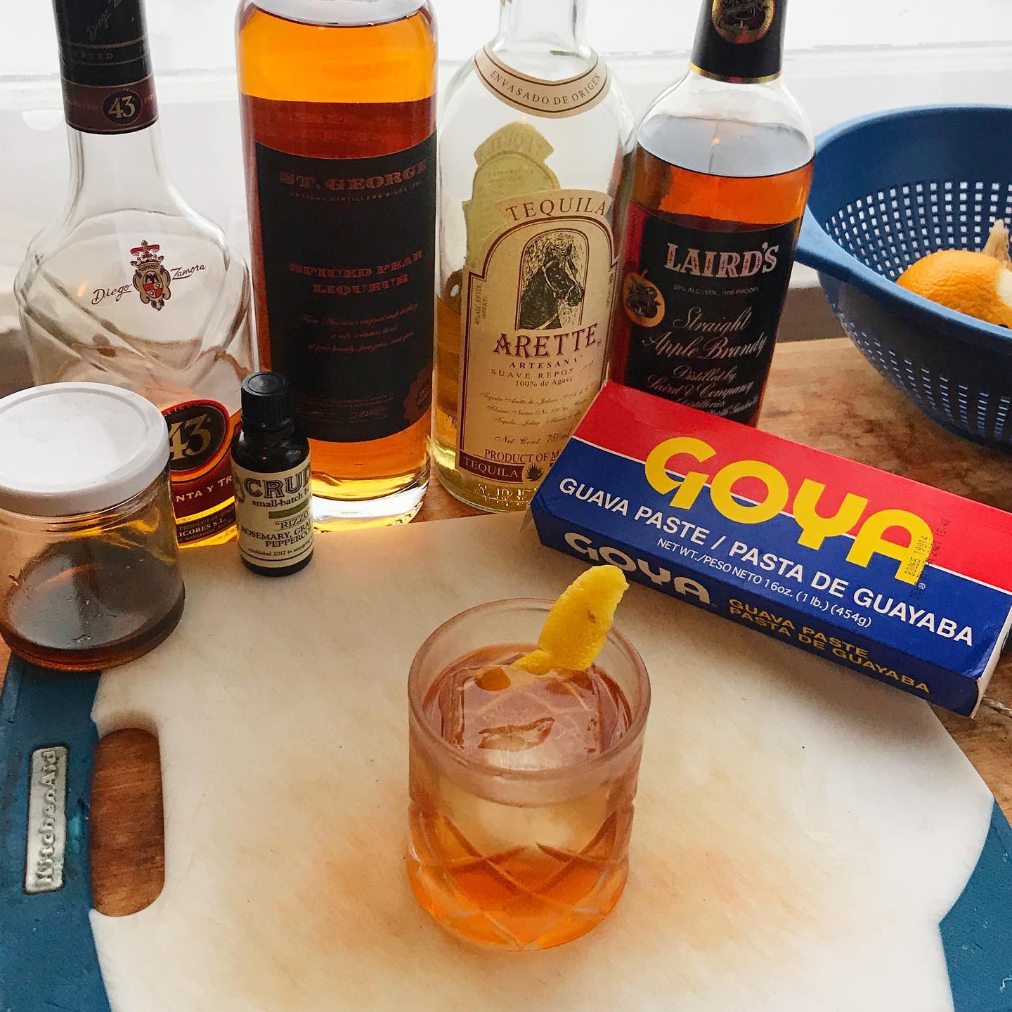 A comforting Old Fashioned riff brimming with autumnal flavors 🍐🍎🥃 The butterscotch, oak, and cinnamon notes in the Reposado tequila work well with the fruit notes in the guava-infused Apple Brandy to provide a flavorful base. The ripe pear and baking spice flavors in the spiced pear liqueur and vanilla-forward liqueur add complementary flavors while the rosemary notes in the bitters provide a hint of savory flavor