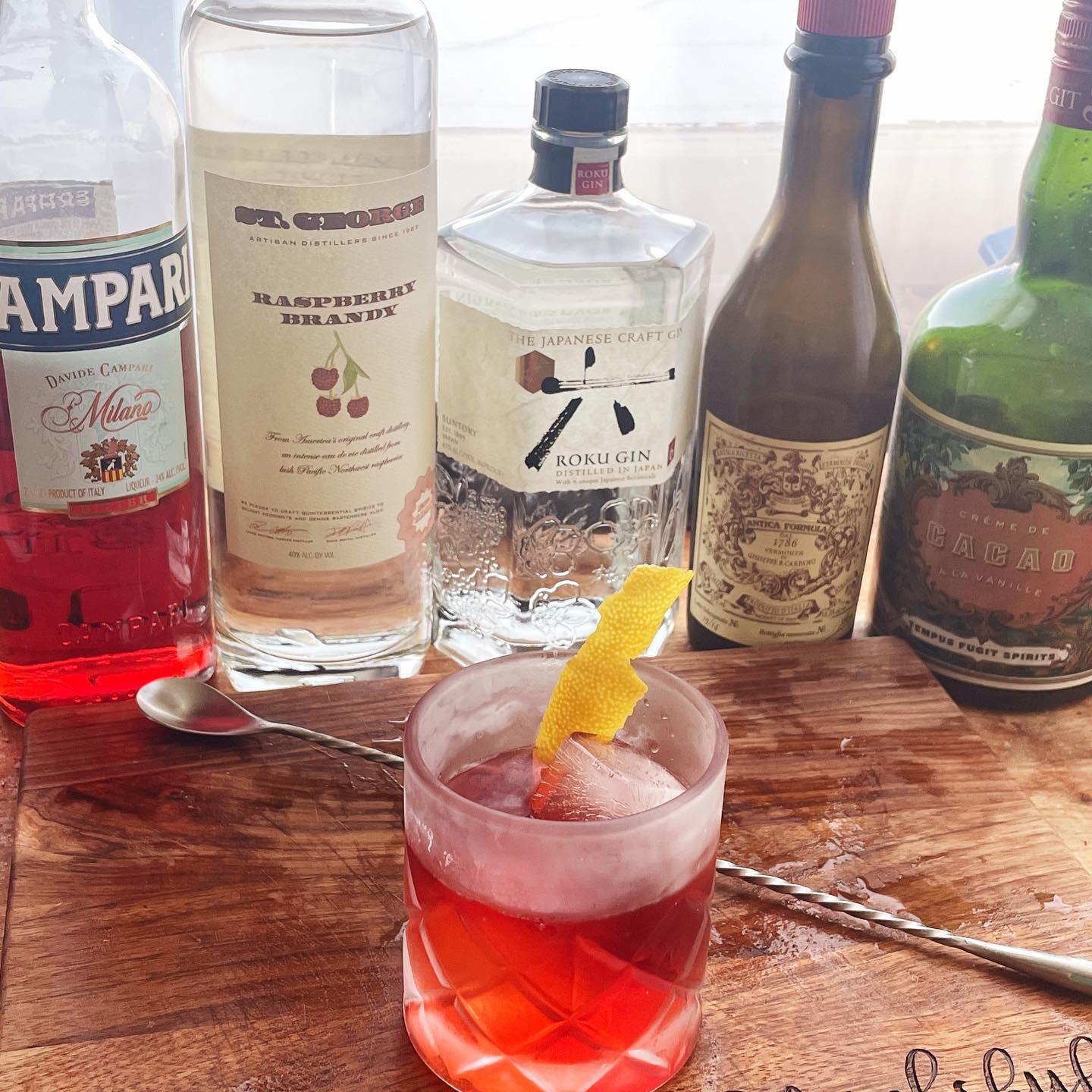 Using a softer Japanese gin (many have notes of yuzu peel, tea leaves, etc in addition to juniper and other traditional botanicals) in place of the more traditional London Dry style allows the ripe raspberry flavor from the raspberry Eau de vie/brandy to shine through. Campari lends its usual bittersweet flavor along with citrus peel notes that complements both berry and chocolate while using a splash of creme de cacao along with the sweet vermouth boosts the cocoa and chocolate notes while the oils from the lemon twist add a pleasant citrus aroma