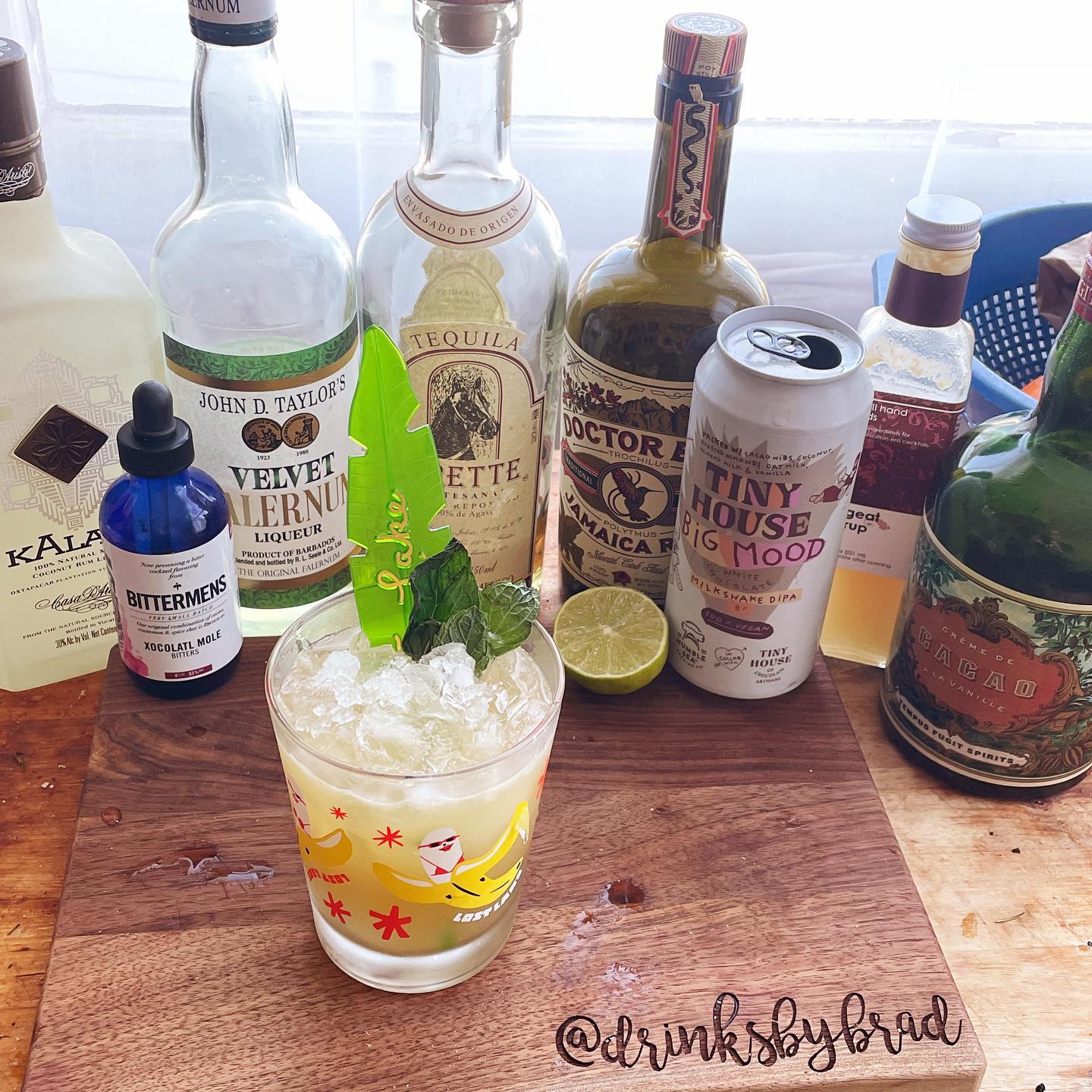 Shake with ice and strain into a chilled double rocks or Mai Tai glass filled with crushed ice. Top with 2 oz Humble Sea Tiny House Big Mood Milkshake IPA with white chocolate/almond/coconut (horchata probably the best sub). Garnish with a swizzle stick and a sprig of fresh mint