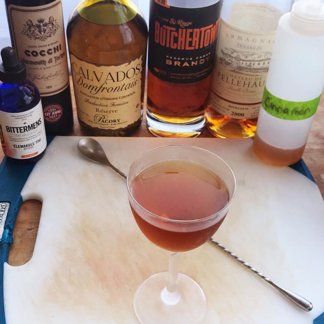 The bit of cinnamon in the syrup and notes of cinnamon and ginger in the Tiki bitters emphasize the fruit notes in the brandies (from apples, pears, and grapes in this mix) while the Sweet Vermouth tames the booziness while adding underscoring notes of cocoa and spice