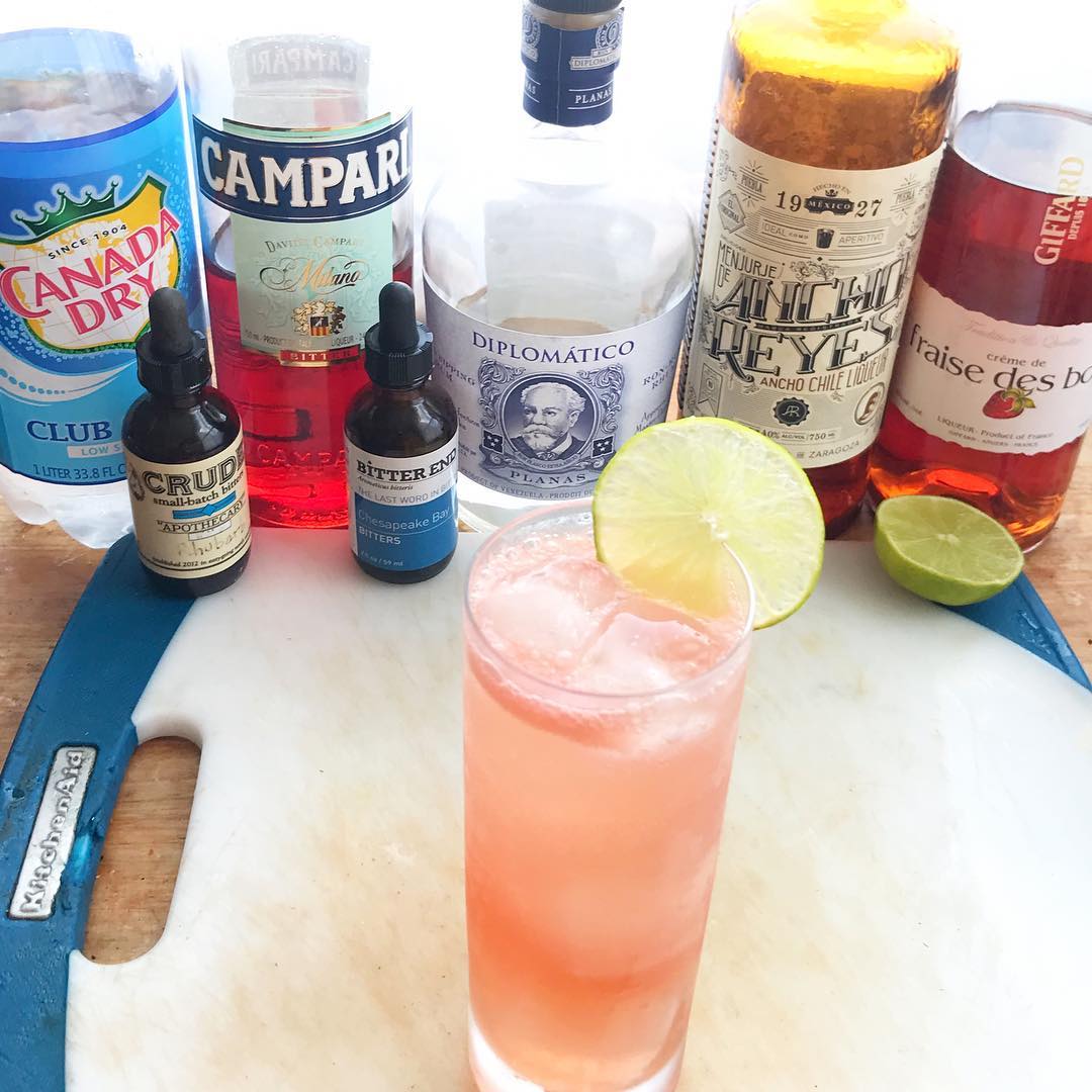 A refreshing highball that was slightly modified from a previous menu at SF’s top-notch Trick Dog that is great as the weather warms up 🌶🍓 The slight tropical fruit and molasses notes in the rum provide a versatile base that is accented by strawberry, ancho chili spice, tart lime, bittersweet Campari, and a bit of vanilla and black pepper from the bitters. The addition of soda water adds a refreshing effervescence
