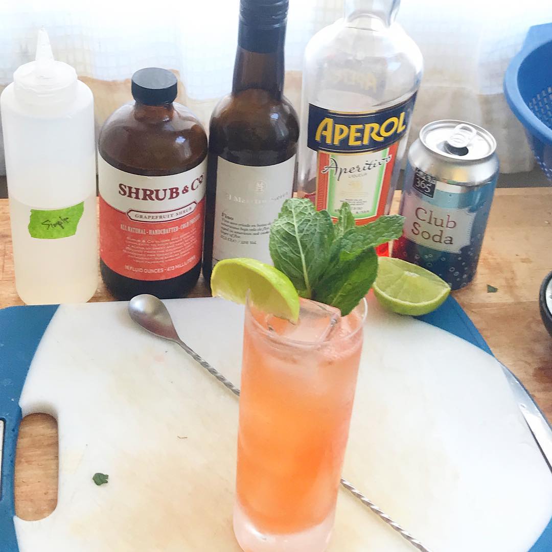 The tart grapefruit and juicy, bittersweet Aperol are complemented by the freshly muddled mint, lime juice, and dry, slightly nutty sherry with bubbles from the club soda