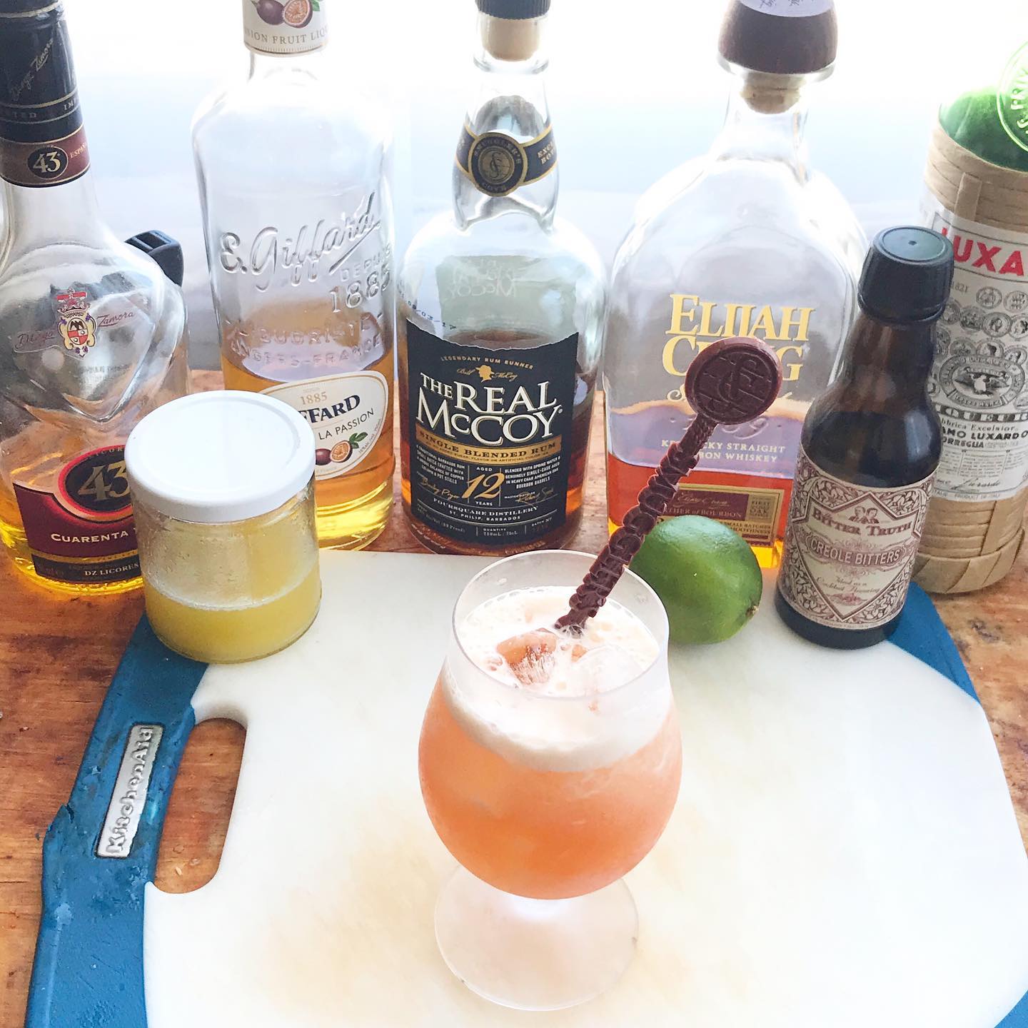 The bright, tropical pineapple juice is complemented by the notes of vanilla, caramelized sugar and baking spice in the aged rum and bourbon blend. The passionfruit liqueur contributes its signature sweet/tart notes and integrates nicely with the pineapple while the vanilla and cherry liqueurs add complementary flavors. The lime juice helps balance the acidity and the anise and spice notes of the Creole (or Peychaud’s) bitters helps bridge the flavors