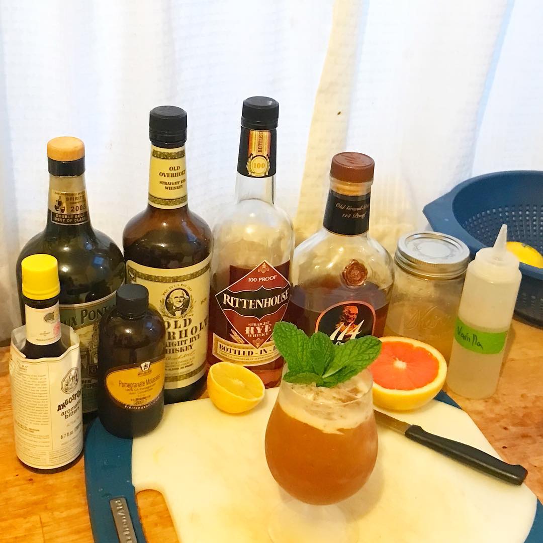The mixture of two rye whiskies and overproof bourbon lends floral and spice elements that work very well with the ginger, vanilla, and citrus. The dash of absinthe and mint garnish add a pleasant aroma
