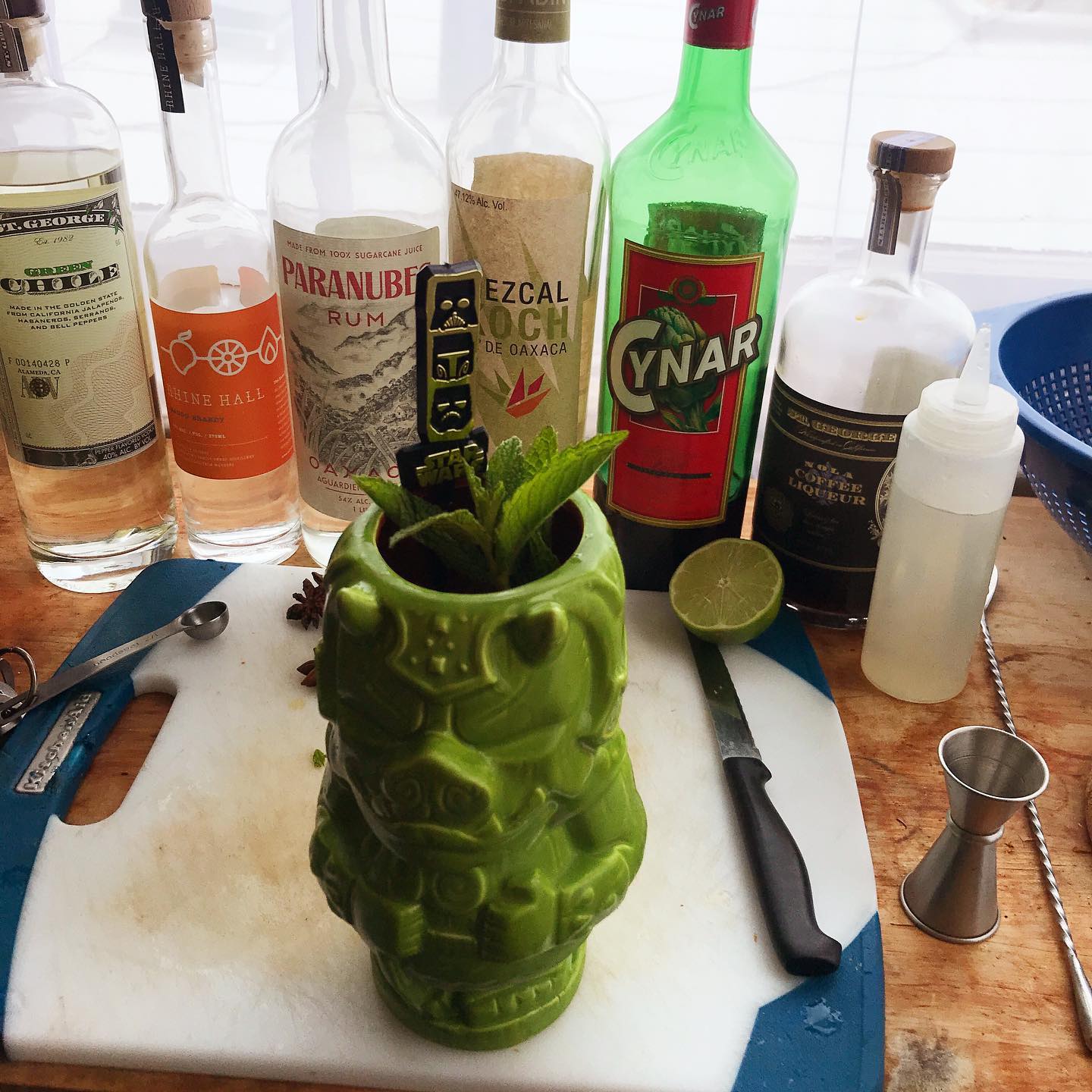 A delightful Tiki drink that layers smoke, fruit, and spice from NYC’s Shannon Mustipher 🏝🗿 The mezcal lends a note of tropical fruit and smoke that is supplemented by the fresh cane and anise notes from the infused aguardiente and the ripe fruit notes of the mango eau de vie. The coffee liqueur and Cynar add some bittersweet, roasted notes while the lime brings freshness and acidity, the bit of green chile lends a hint of vegetal spice, and the mint lends a pleasant aroma