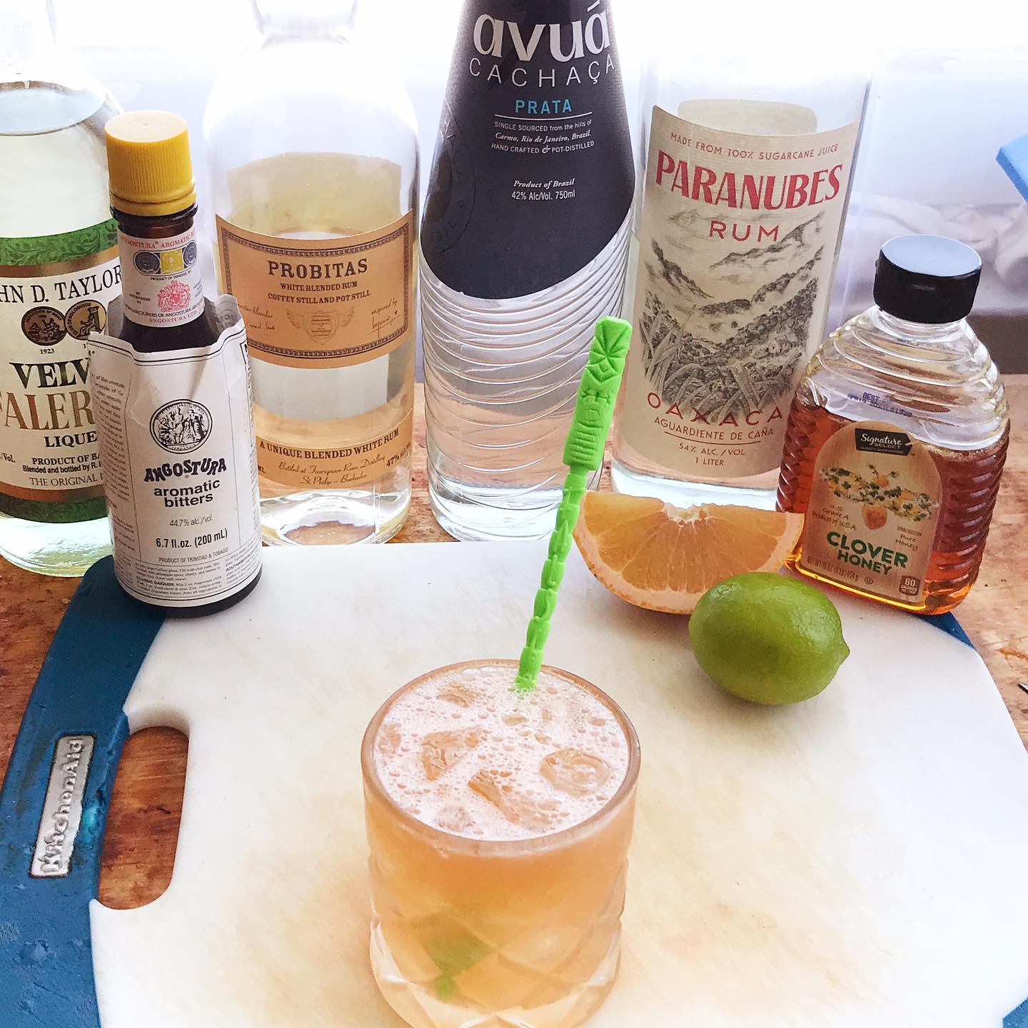 The blend of sugarcane rum spirits and funky Probitas provides a base with flavors of sugarcane, grass, molasses with hints of tropical fruit and sea breeze. The deep sweetness of the honey syrup works well with the sugarcane notes while also pairing well with the grapefruit and lime juice mix. The addition of Falernum and Angostura add some island spices (clove, allspice) and a pinch of salt helps the flavors pop