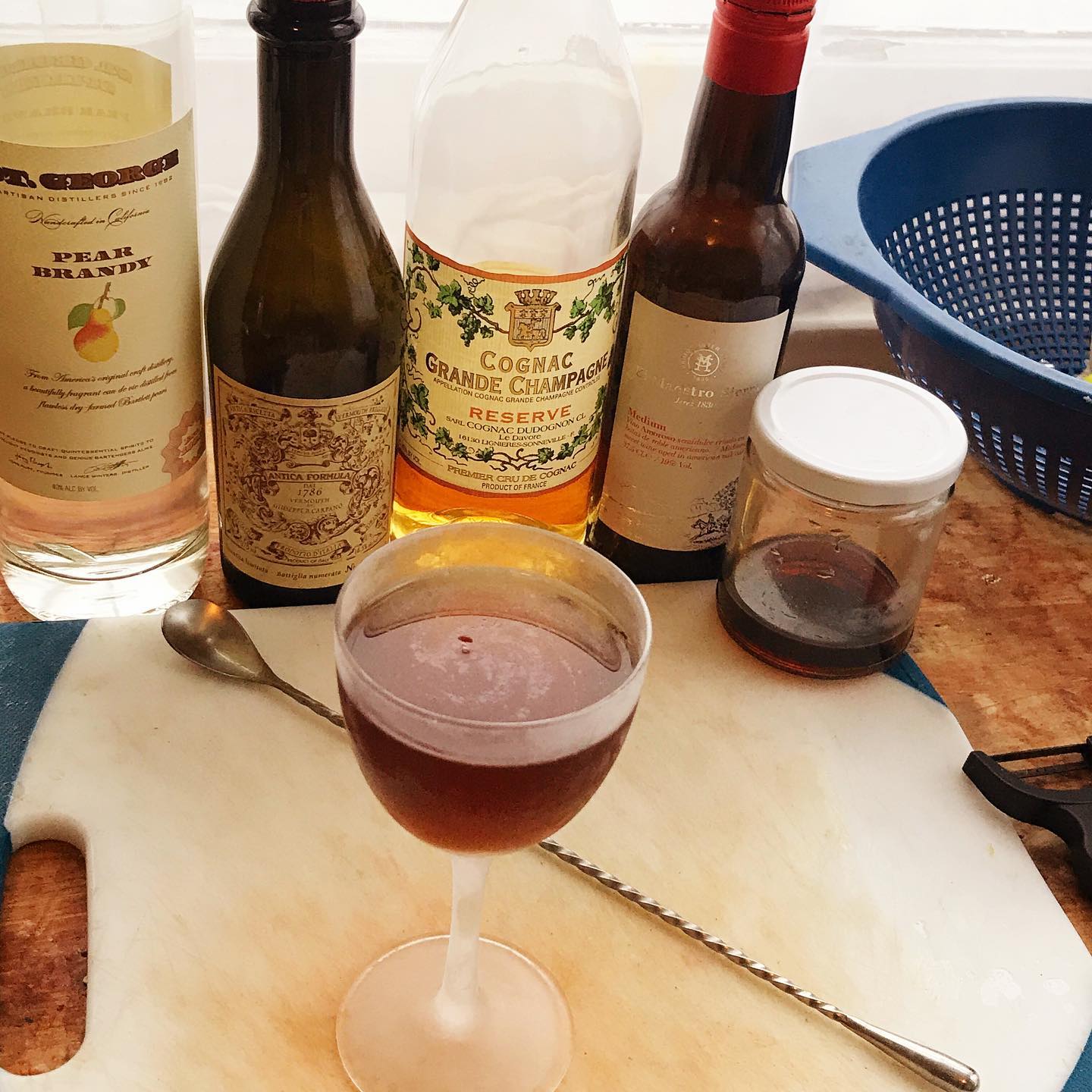 The aged cognac has notes of orchard fruits like fig, pear, and apple along with hints of caramel and works beautifully with the nutty flavors in the cream sherry and the cocoa/vanilla flavors in the Sweet Vermouth. The small additions of pear brandy and rich simple syrup lend complementary hints of ripe pear and brown sugar while the essential oils from the lemon twist lend a pleasant citrus aroma