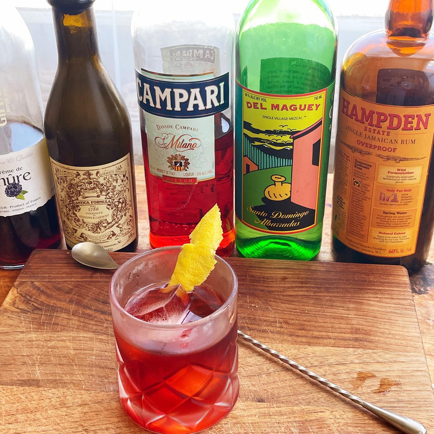 A smoky, bittersweet Negroni riff (inspired by Joaquin Simo’s modern classic Kingston Negroni) with notes of blackberry and roasted tropical fruit 🥃🫐