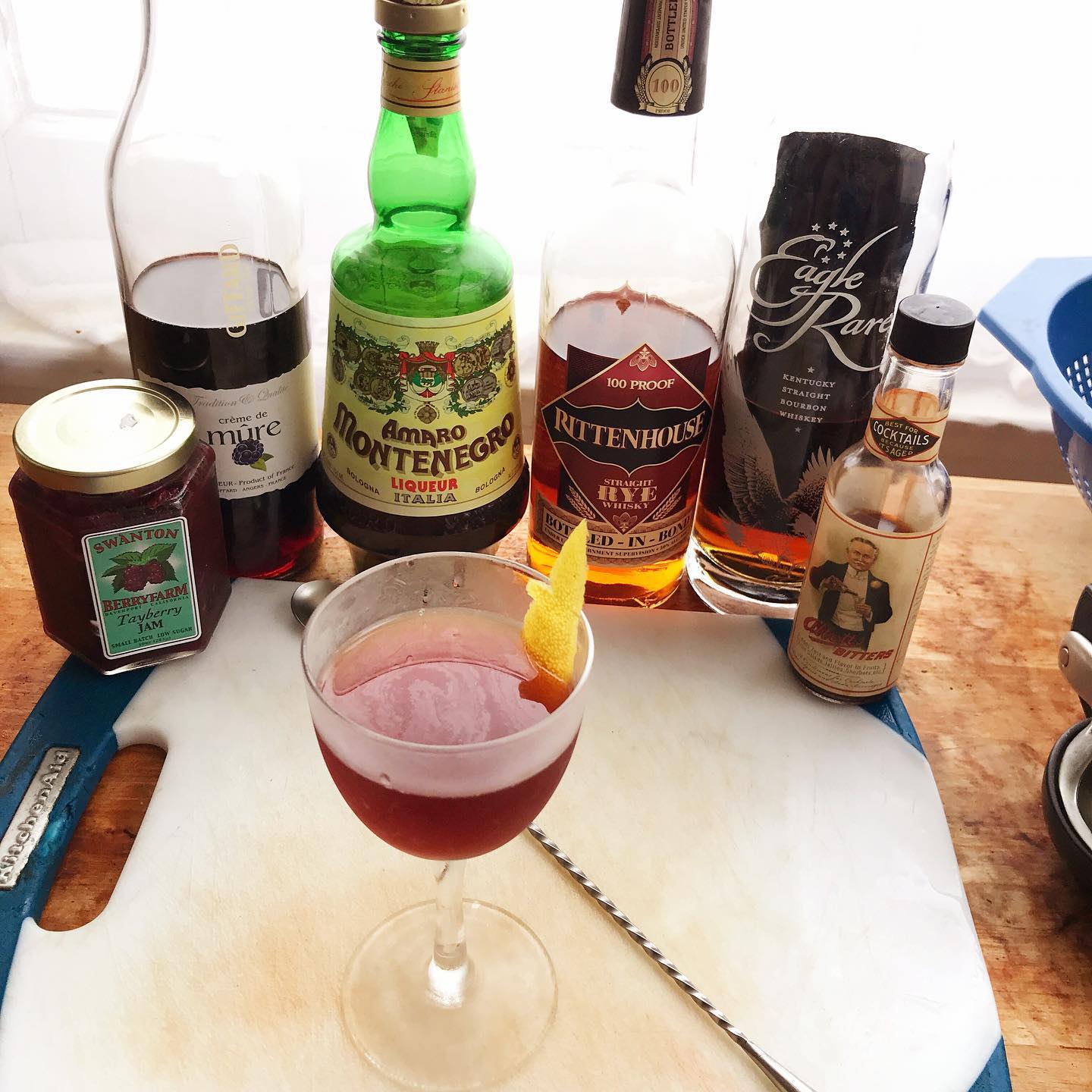 The baking spice and black pepper notes in the rye whiskey and bourbon (which also brings a whisper of vanilla and caramel) works very well with the berry flavors while the Amaro lends a touch of bittersweetness and a faint note of cherries. The bitters boost the baking spice notes while the essential oils from the lemon twist add pleasant aroma and a bit of zing